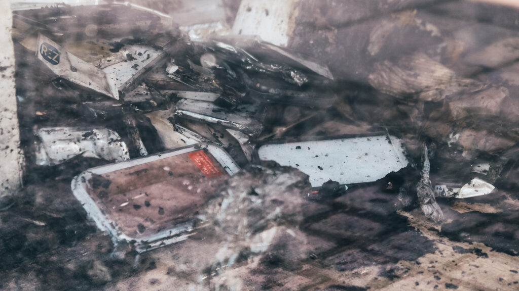 En stor bunke brændte og sammensmeltede genstande, især mobiltelefonudstyr, blev båret ud af butikken og lagt på gaden. Disse genstande er nu en del af politiets efterforskning.