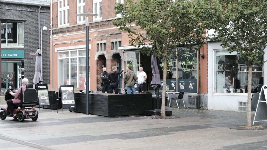 Samtidig med aktionen omkring Nymarksvej, var politiet også til stede i centrum i Fredericia. Angiveligt har de spurgte flere forretninger om de har videoovervågning.