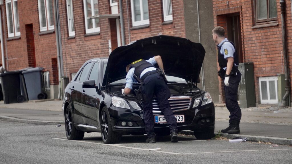 Vores reporter på stedet berettede, at en Mercedes har fået ransaget motorrummet, der var tale om en sort E-klasse.