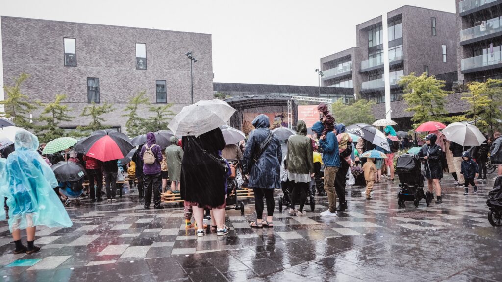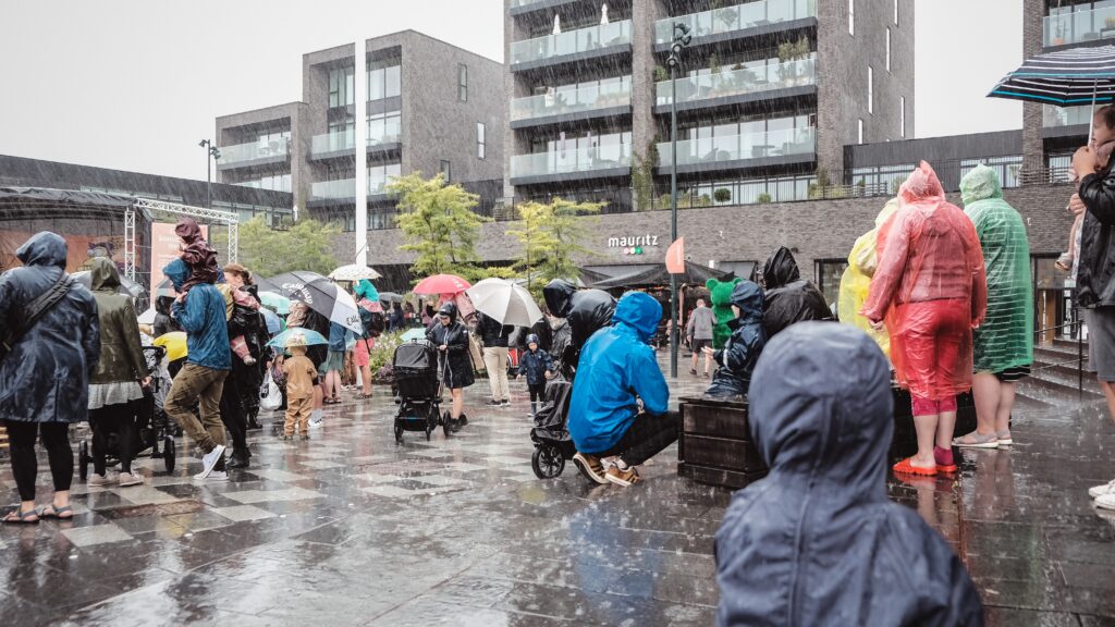 I ly af regntøj og under paraplyerne er en skare på et par hundrede forældre og børn samlet. De står her, de danser, de synger – trods regnen. Sommerferien lakker mod enden, men de er ikke klar til at give slip på ferieglæden endnu.