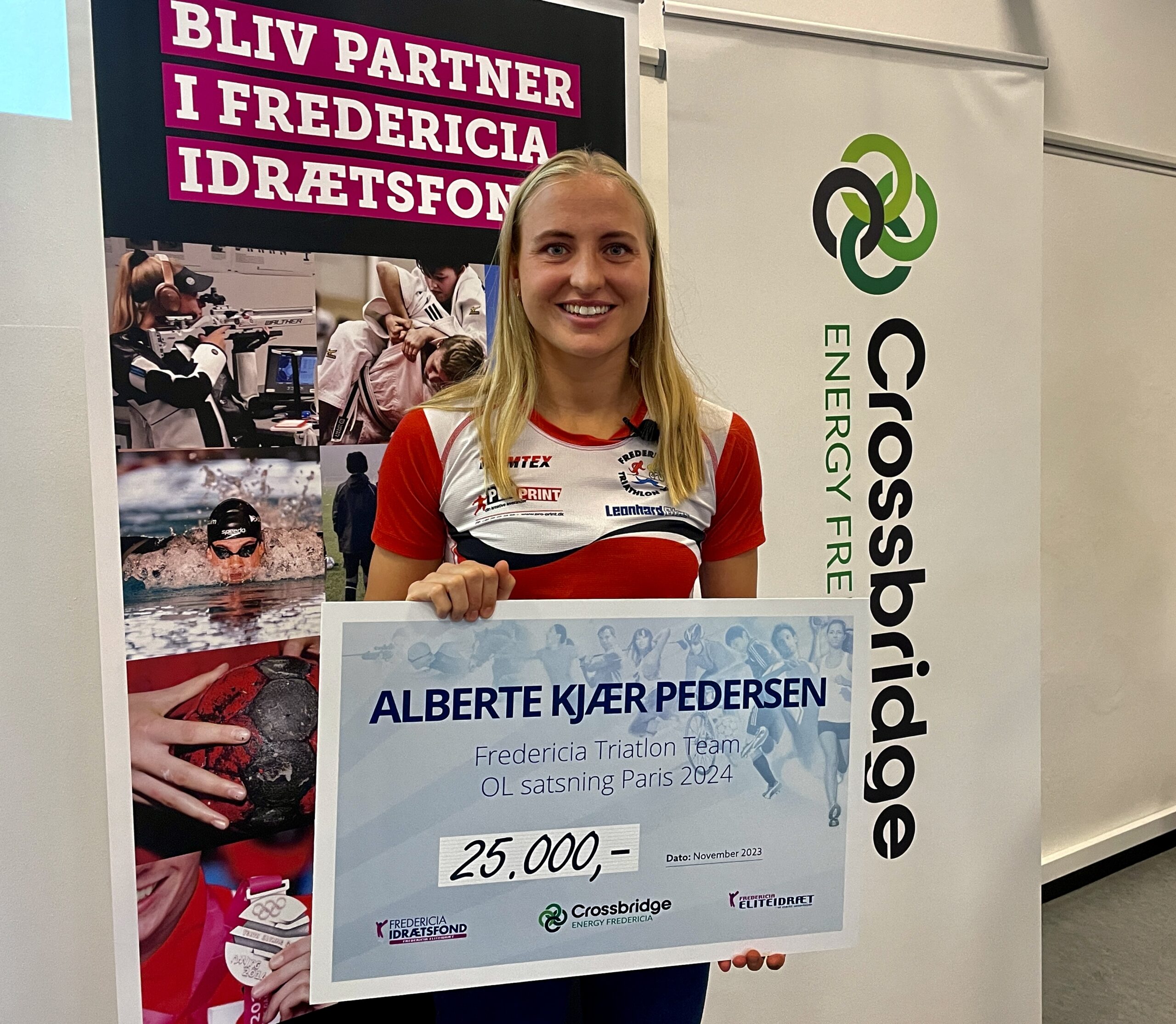 Onsdag blev Alberte Kjær Pedersen og fire øvrige atleter, der er tilknyttet Fredericia Eliteidræt, tildelt 25.000 kroner hver. Det sker som et led i deres mål om at kvalificere sig til OL 2024, og pengene kommer fra idrætsfondens hovedsponsor, Crossbridge Energy.