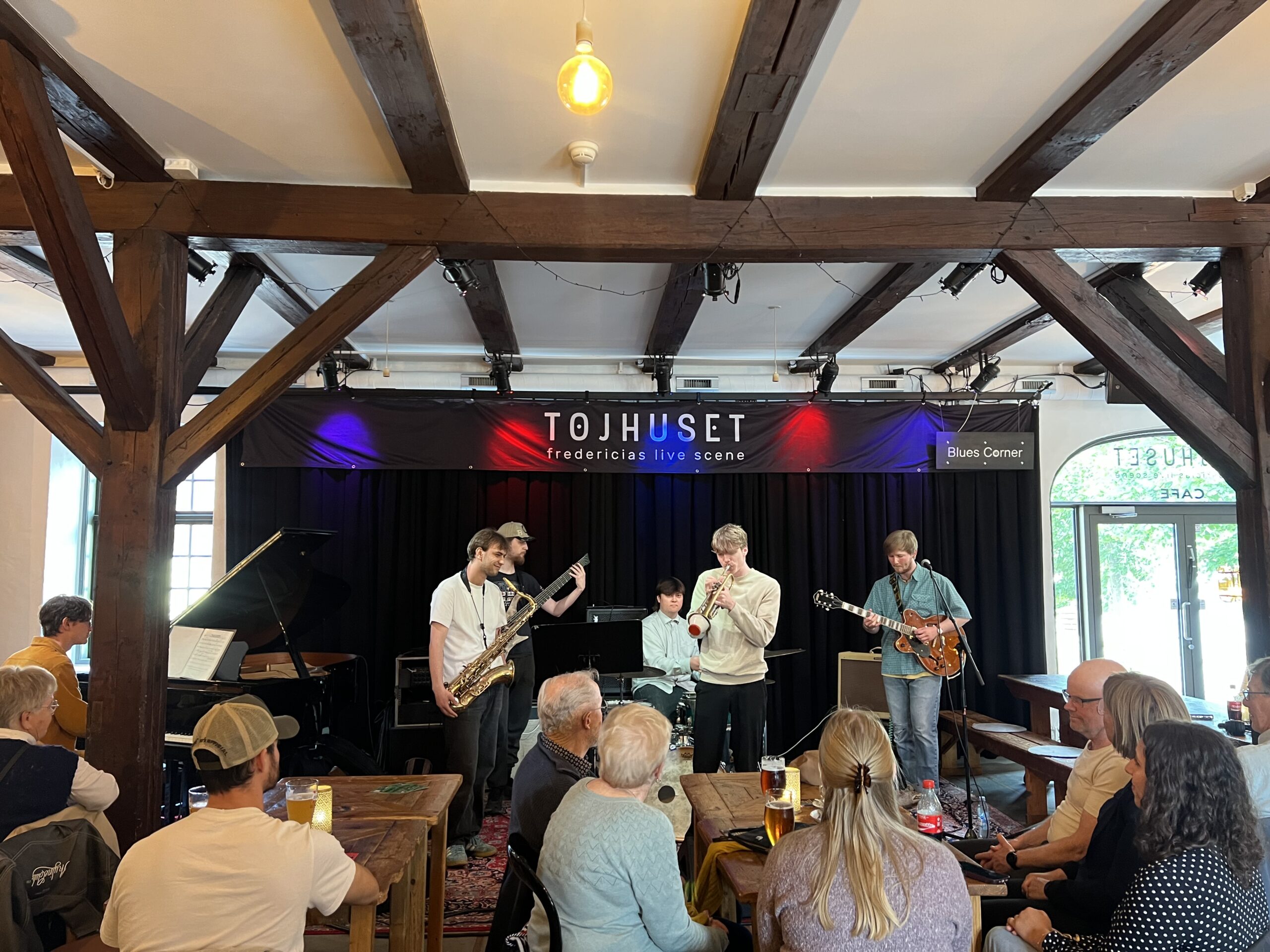 EVENTS. Afslappet summen fra publikum, let klirrende glas i baren og toner, der prøvende finder sammen på scenen – det er kendetegnene ved FredagsJAM på Tøjhuset. Her mødes musikere, unge som gamle, nye som erfarne, i en stemning, der minder mere om en hyggelig dagligstue end et egentligt spillested. Blandt musikerne er den unge fredericianer Anton Kløvgård Rothemejer, der fredag aften vendte hjem til sin hjemby med en sekstet og en klar mission om at give både jazz og musikalsk glæde videre til publikum.