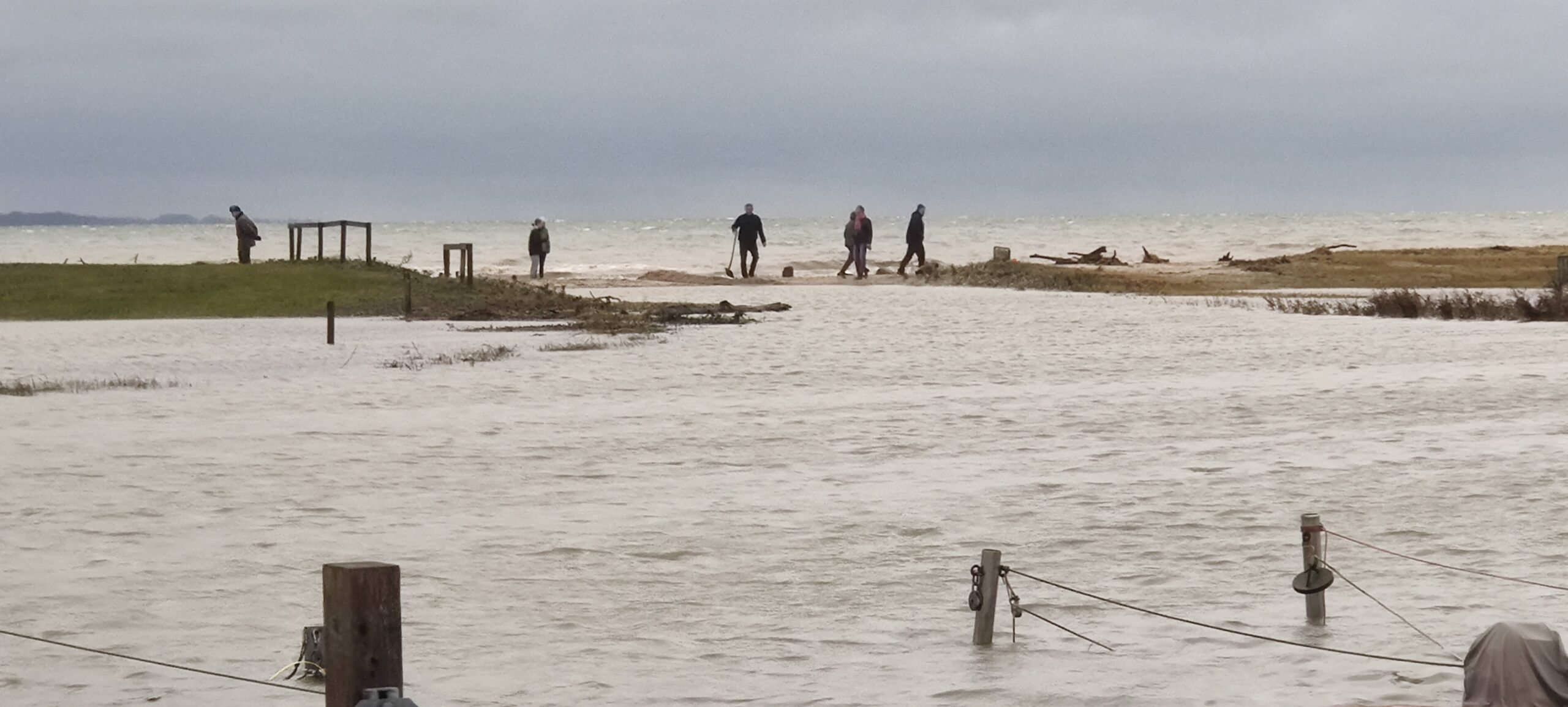 • På grund af det fortsatte højvande, har frivillige sat spaderne i jorden for at grave en rende, så vandet kan drænes ud af udmundingen.