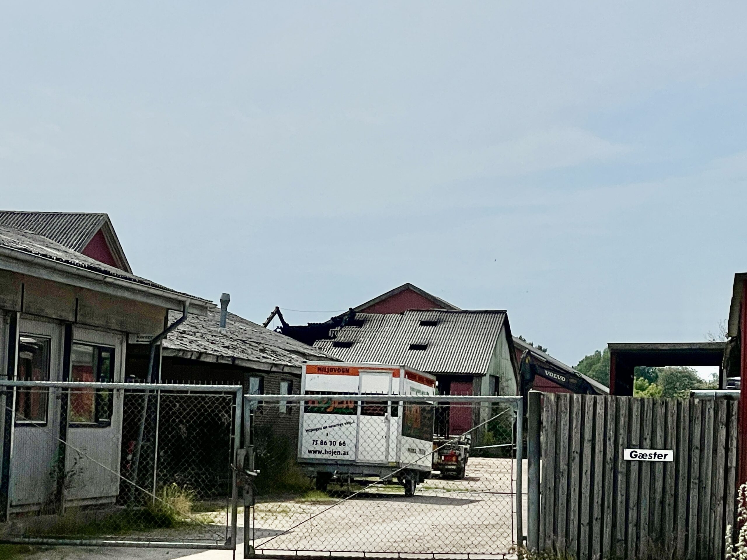 Søndag middag ligger Højen Maskinstation stille hen, hvor lørdagens dramatiske brand har efterladt sine tydelige spor. Væk er de mange udrykningskøretøjer, og afspærringerne er fjernet, men porten ind til ejendommen er smækket i. Udefra kan man stadig se de omfattende skader på taget af den medtagede bygning, som står i kontrast til den ellers fredelige og idylliske Baunholtvej syd for Vejle.