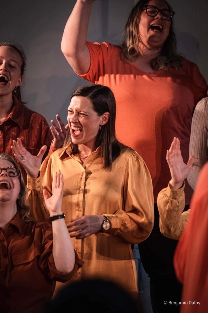Dette menneske, der strikker, sylter, går i haven, synger rock and roll, laver saft, upcycler, synger gospel, udnytter ressourcerne, er en person med mange kontraster og overraskelser. Hun kan godt være lidt klodset (censureret), men ikke på scenen.