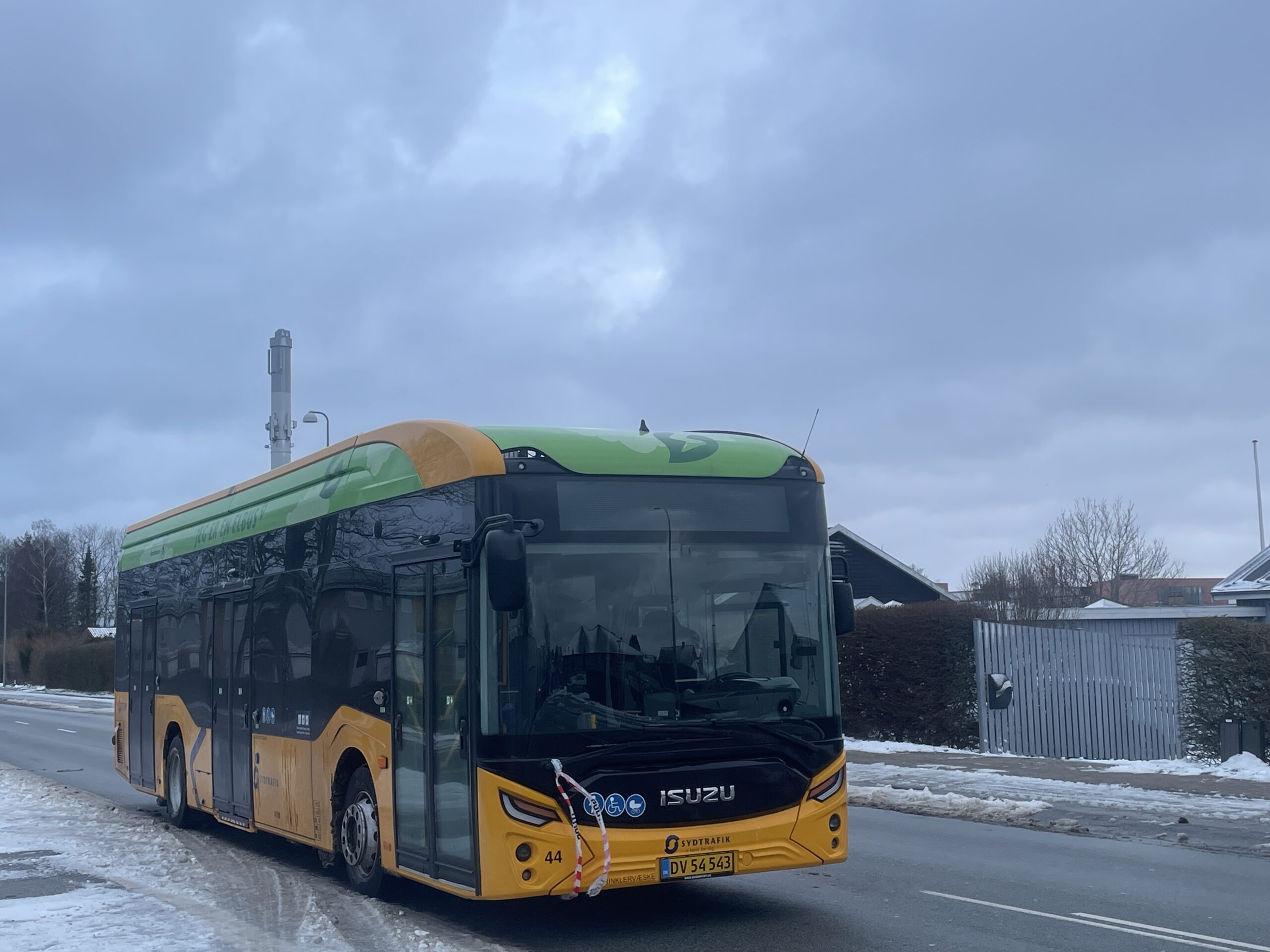En el-bus holder midt på vejen på Indre Ringvej i Fredericia.