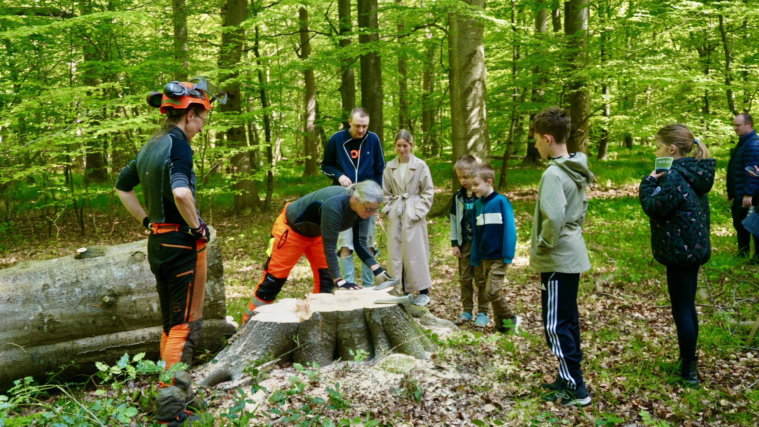 Efter velkomsten blev gæsterne præsenteret for en række spændende aktiviteter, herunder en træfældning, som vakte stor interesse blandt deltagerne. Der var planlagt fældning af to bøgetræer, hvoraf det ene træ skulle fjernes på grund af skader forårsaget af en vinterstorm. På en pædagogisk og engagerende måde blev processen forklaret ved hjælp af en planche, som detaljeret beskrev, hvordan fældningen skulle udføres. Efter kun ti minutter faldt det første træ præcist i den planlagte retning, til stor fascination for tilskuerne.