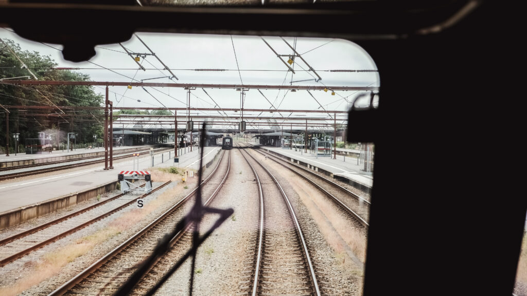 Efter skoven ændres landskabet drastisk. Fra det grønne og frodige skovlandskab til Fredericias kendte station. Her kører toget først frem ad det ene spor, hvorefter det bakker ned ad det yderste spor til højre – det spor, der leder ned til havnen. Vi passerer det gamle vandtårn, der i sin tid forsynede damplokomotiverne med vand. Det minder os om jernbanens historie, en historie i konstant udvikling.