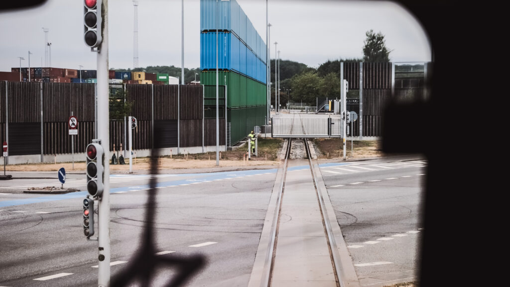 Turen fortsætter under Prangervej, hvor Banedanmark har et lager af nye skinner liggende, inden vi ankommer til havnen. Her kan kun halvdelen af vognene holde, så nogle vogne bliver sat af, mens resten køres ned for at blive lastet.
