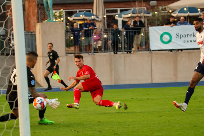 Hurtigt udnyttede FC Fredericia overtallet. I det 56. minut stak Adam Jakobsen bolden i dybden til Sofus Berger, som ikke svigtede i den direkte duel mod Falkesgaard. Med et velplaceret skud bragte han FC Fredericia foran med sit første mål i FC Fredericia-trøjen.