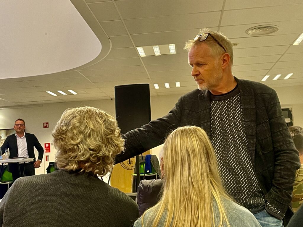 Henrik Dahl (tv) og Helena Artmann Andresen (tv) – begge medlem af Folketinget for LA var også til stede i salen. Henrik Dahl fik trænet publikums lattermuskler, da han forudså et forsvar med samme hastighed som PostNorden. Peter Hagmund gik rundt med mikrofonen. Foto: AVISEN