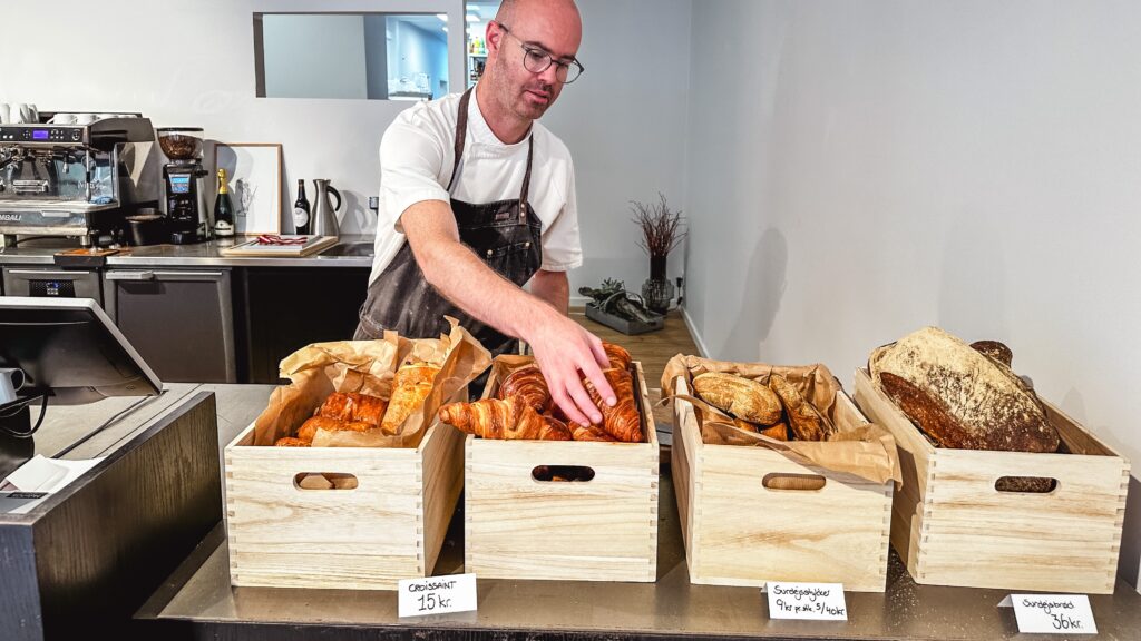 – De fire kasser her med henholdsvis croissanter, pain au chocolat, surdejstykker og de store surdejsbrød, tror jeg, har været med til at sætte rigtig gang i butikken. Potentielt betjener jeg dobbelt så mange på en dag som i dag, som for en måned siden. Jeg bruger selvfølgelig kun de bedste råvarer, og croissanterne er lavet med masser af godt dansk smør, fortæller Kristian, mens han med stolthed præsenterer dagens bagværk.