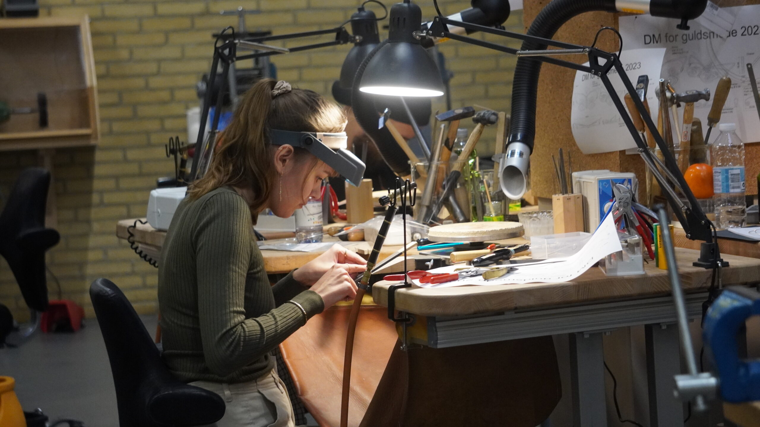 I det pulserende lokale på er atmosfæren intens, mens de syv guldsmede arbejder fokuseret og præcist. Lyden af fint værktøj, der møder metal, fylder rummet, hvor koncentrationen er næsten håndgribelig. Alle er dybt fordybet i deres håndværk, med øjnene fastlåste på de fine detaljer ved deres sommerfugle-vedhæng. Trods det trykkende tidspres og konkurrenceelementet, hersker der en følelse af respektfuld håndværksmæssig stolthed. Arbejdet er i fuld gang, og hver enkelt deltager er fast besluttet på at forme det mesterværk, der kan give dem DM-guldet.