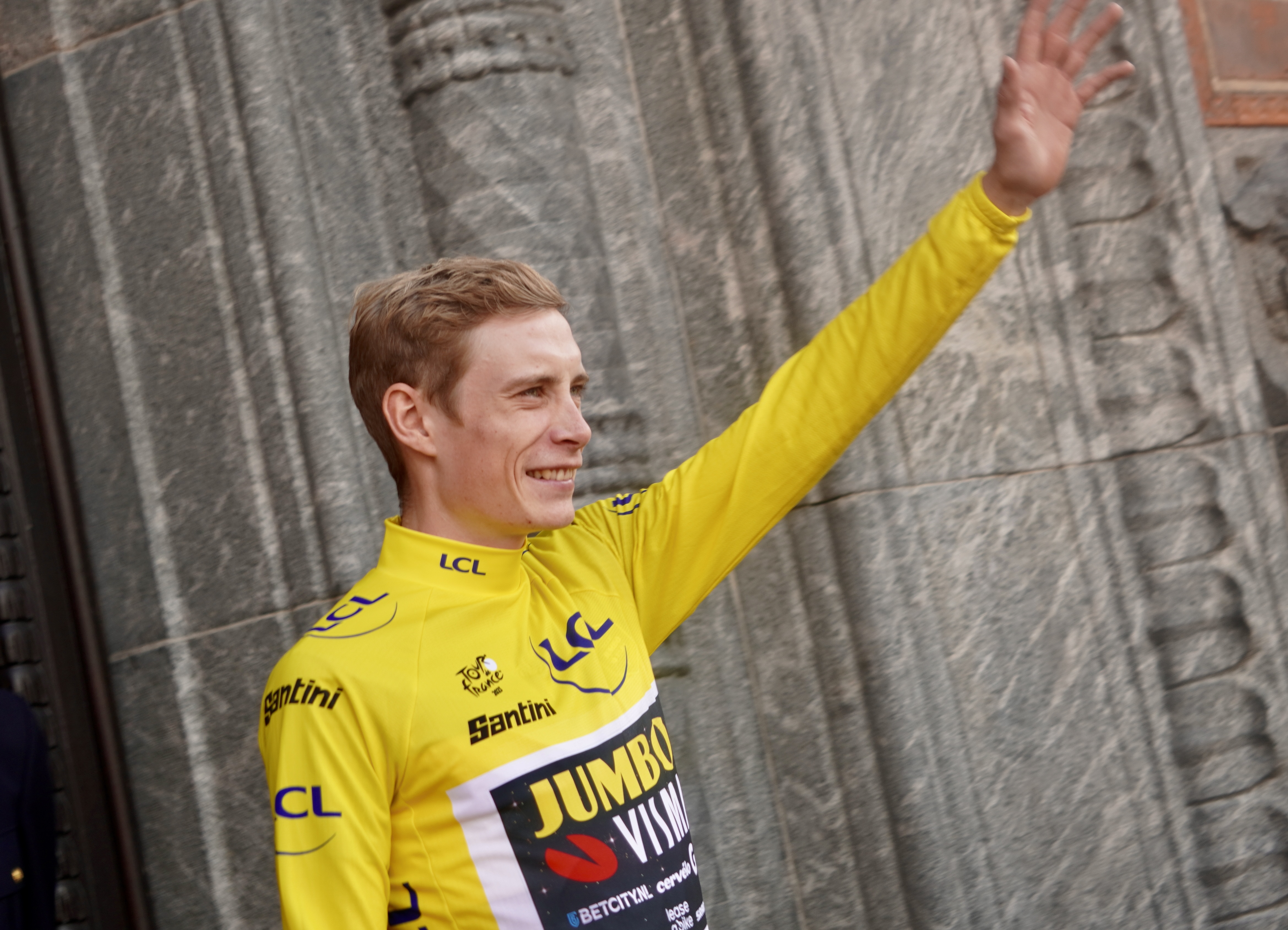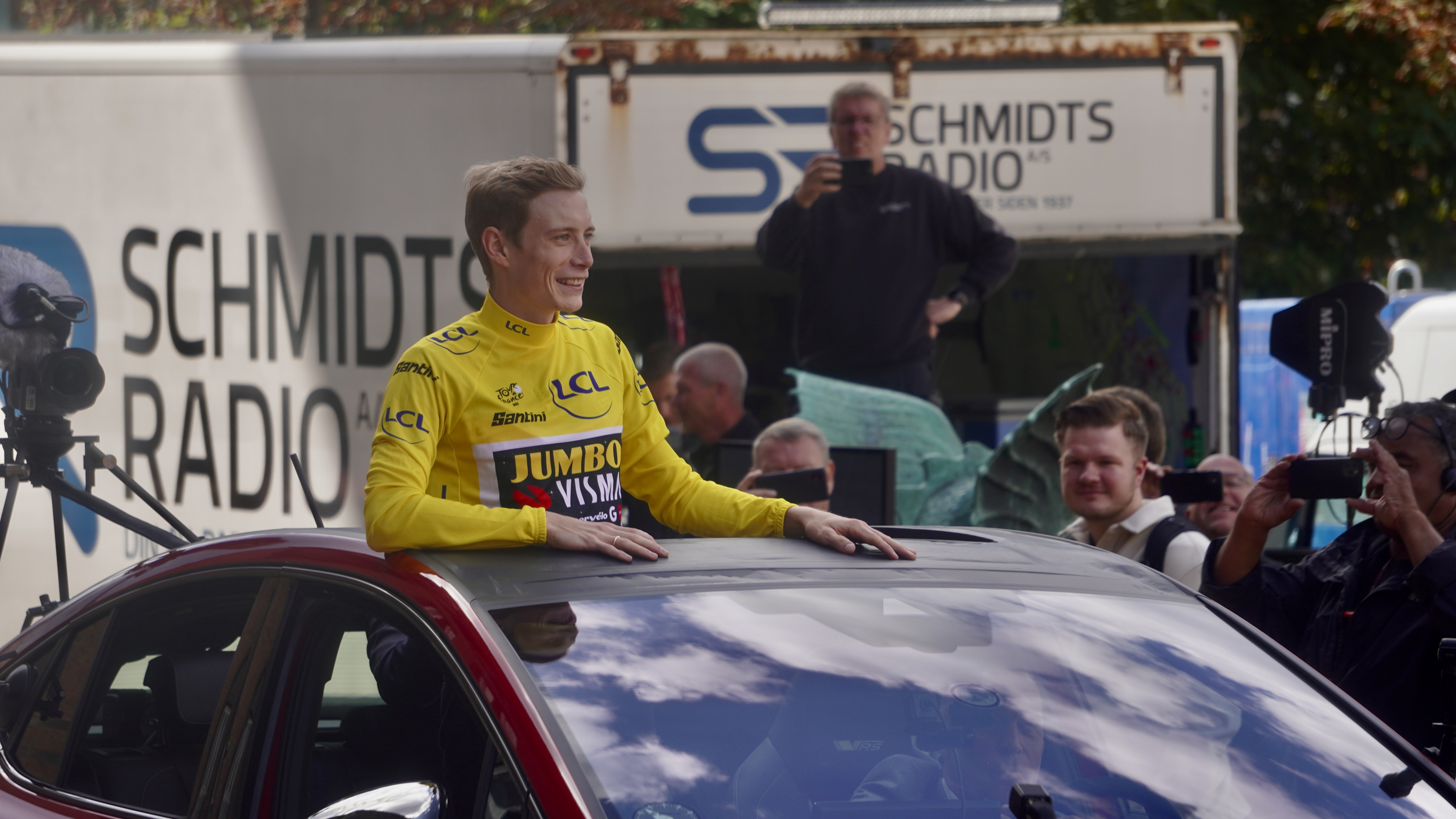 Spændingen steg og steg. Omkring klokken 13:00 kom hovedpersonen selv, Jonas Vingegaard, i en åben Skoda. Han vinkede til folket, der også fik et par ord med på vejen, inden at turen gik ind på Rådhuset, hvor der en række taler.