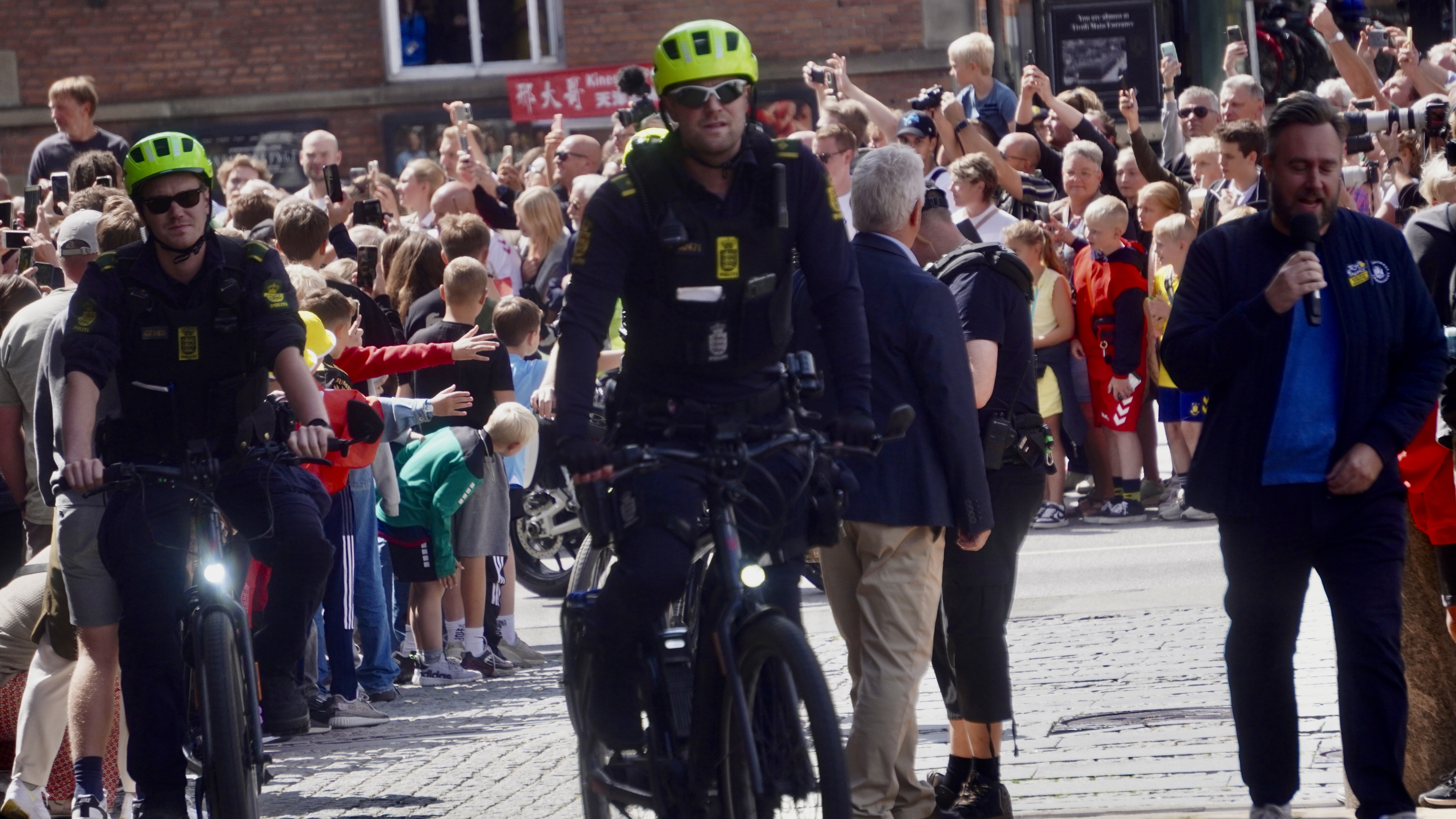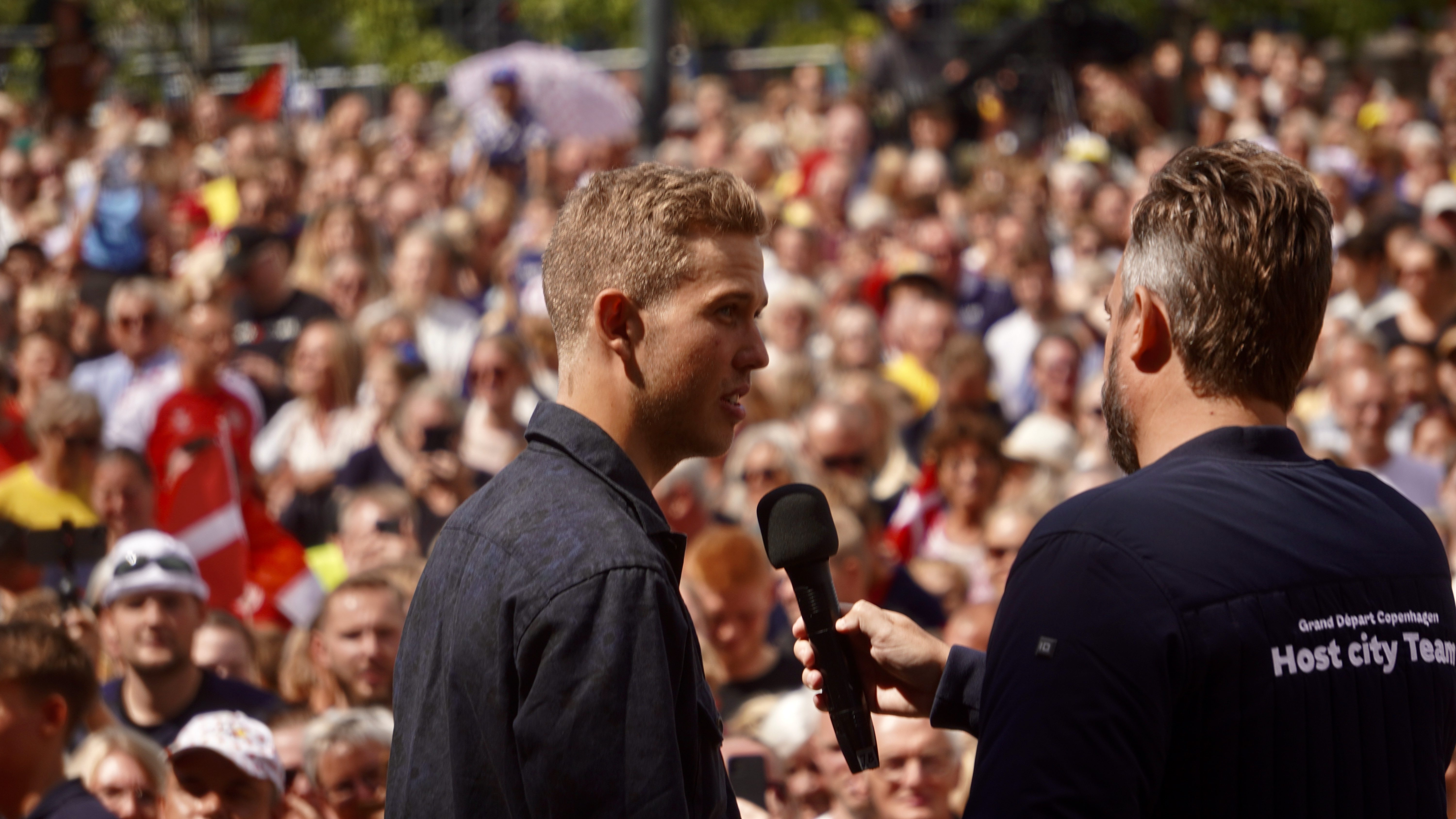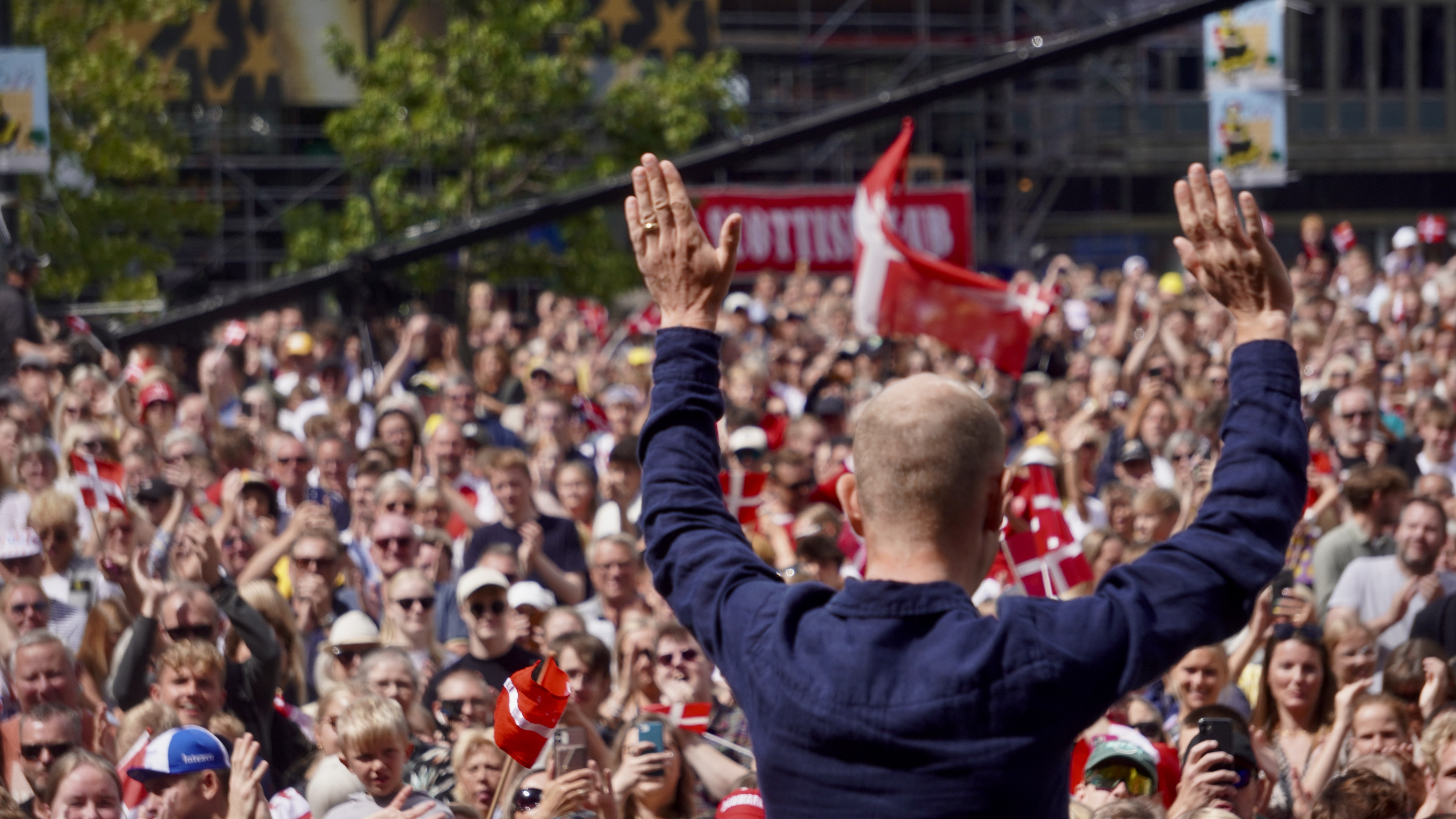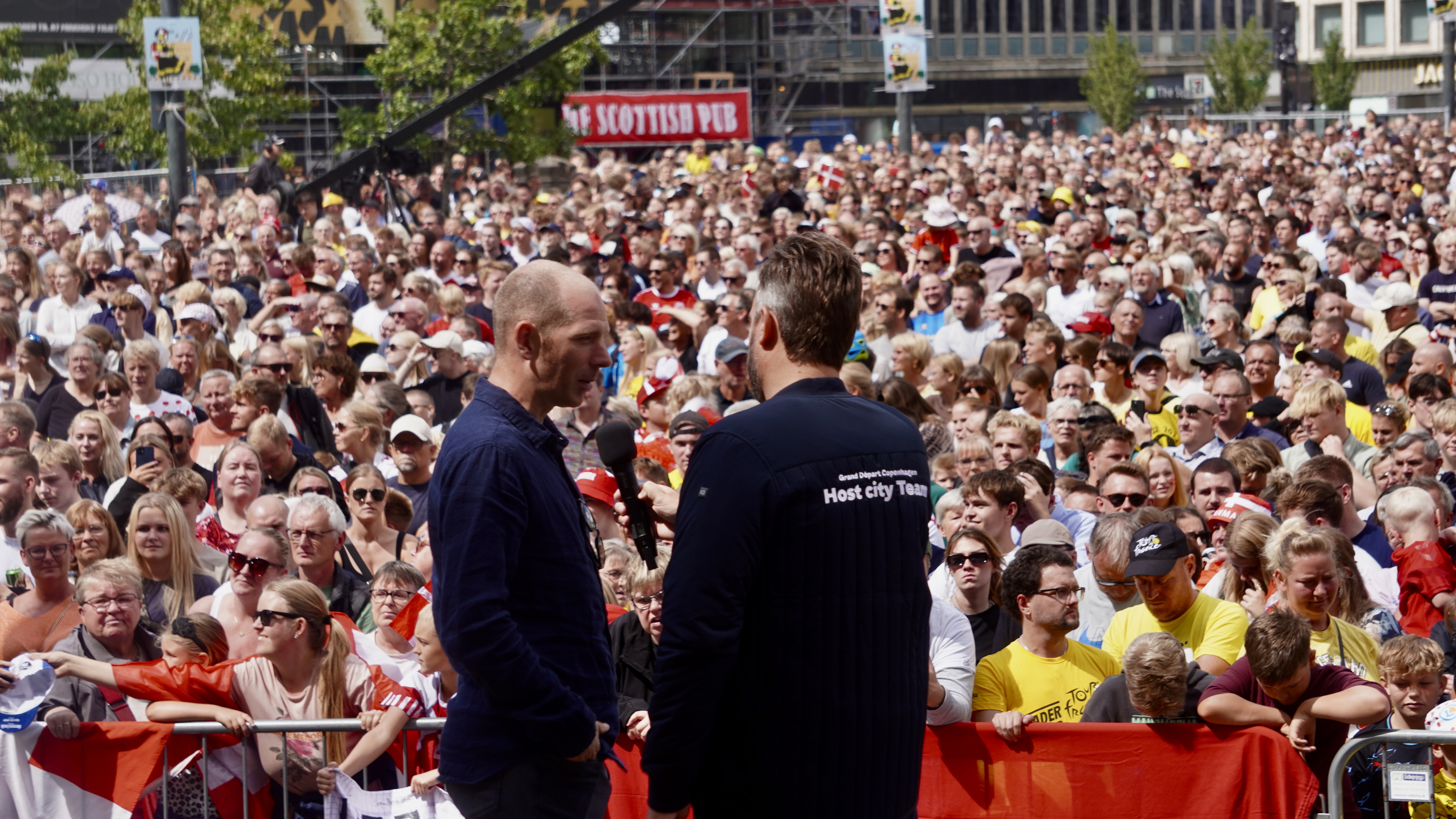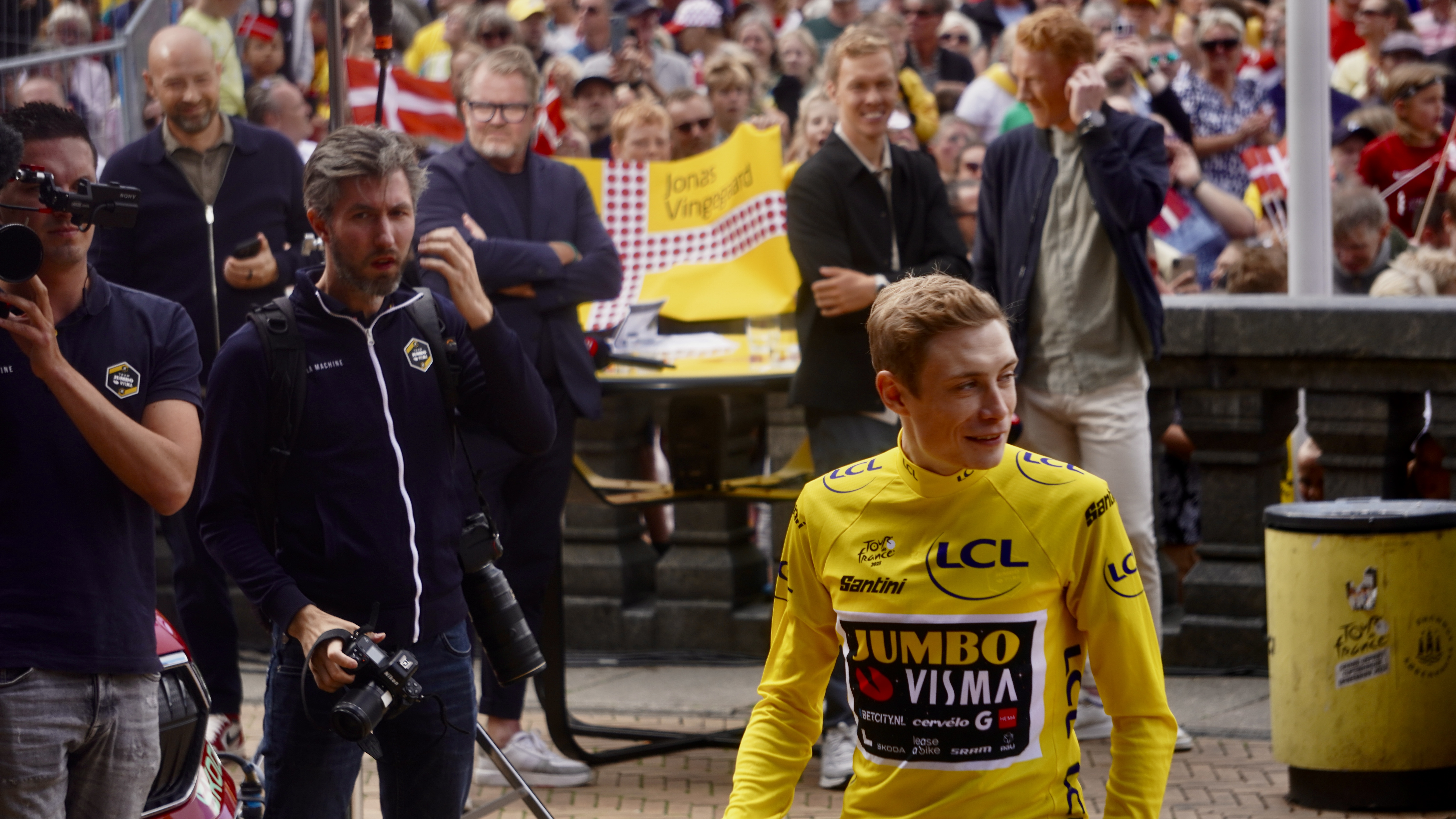 På Rådhuspladsen, som var fyldt med mennesker fra tidlig morgen, styrede den kendte tv-vært, Jimmy Bøjgaard, begivenhederne. Der blev spillet “De skal have baghjul nede i Touren” på trompet, og råb af “Jonas” blev besvaret med et rungende “Vingegaard” fra mængden.