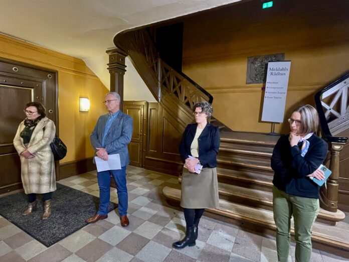 Da klokken ramte 17:30 trådte udvalgsformand, Søren Larsen (A), Mette Heidemann (direktør for beskæftigelse og velfærd) og Henriette K. Graversen (koncernchef for social og handicap) ned ad trapperne fra 1. salen, hvor mødet blev holdt. Søren Larsen startede med at tage ordet og sagde: