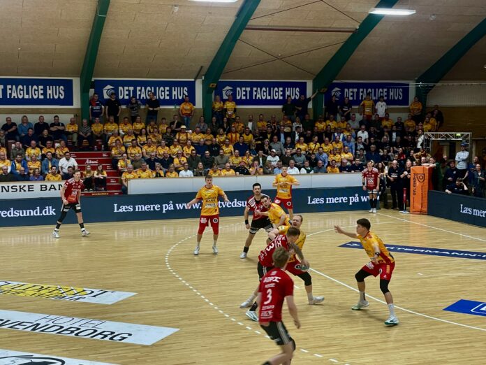 Erritsø GIFs Nils Hagen øger føringen i sidste weekends hjemmekamp mod Aalborg RK. Han er med i landsholdstruppen, der skal møde Norge lørdag eftermiddag. Foto: Ivar Tidemand.
