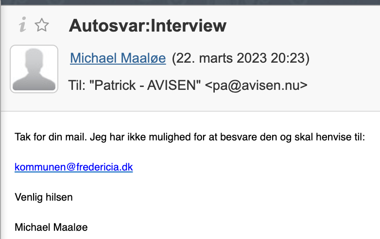 AVISEN forsøgte onsdag aften at komme i kontakt med Michael Maaløe med henblik, at der torsdag er møde i Børne- og Skoleudvalget. Der blev vi mødt af nedenstående autosvar: