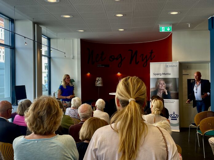 Den bagerste del af Fredericia Biblioteks stueetage var omdannet til stolerækker for at huse de fremmødte i forbindelse med ældreminister Mette Kierkgaards besøg. Lokalet summede af forventning, da både lokalpolitikere og andre interesserede borgere havde fundet vej til biblioteket for at deltage i dialogen om fremtidens ældrepleje.