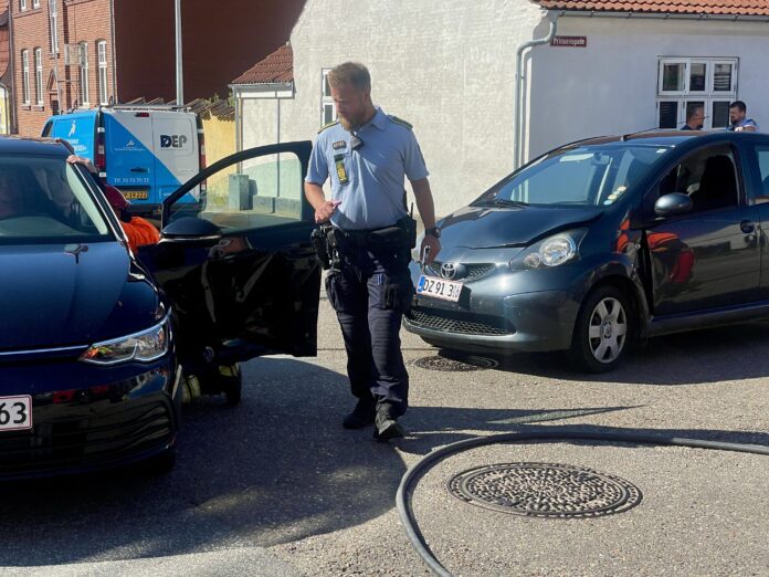 To biler er kørt sammen på Prinsensgade i Fredericia klokken lidt over 10. Den ene bil er kommet fra Prinsensgade og påkørt en anden bil. Føreren af den bil, der blev kørt ind i, er blevet tilset af en ambulance