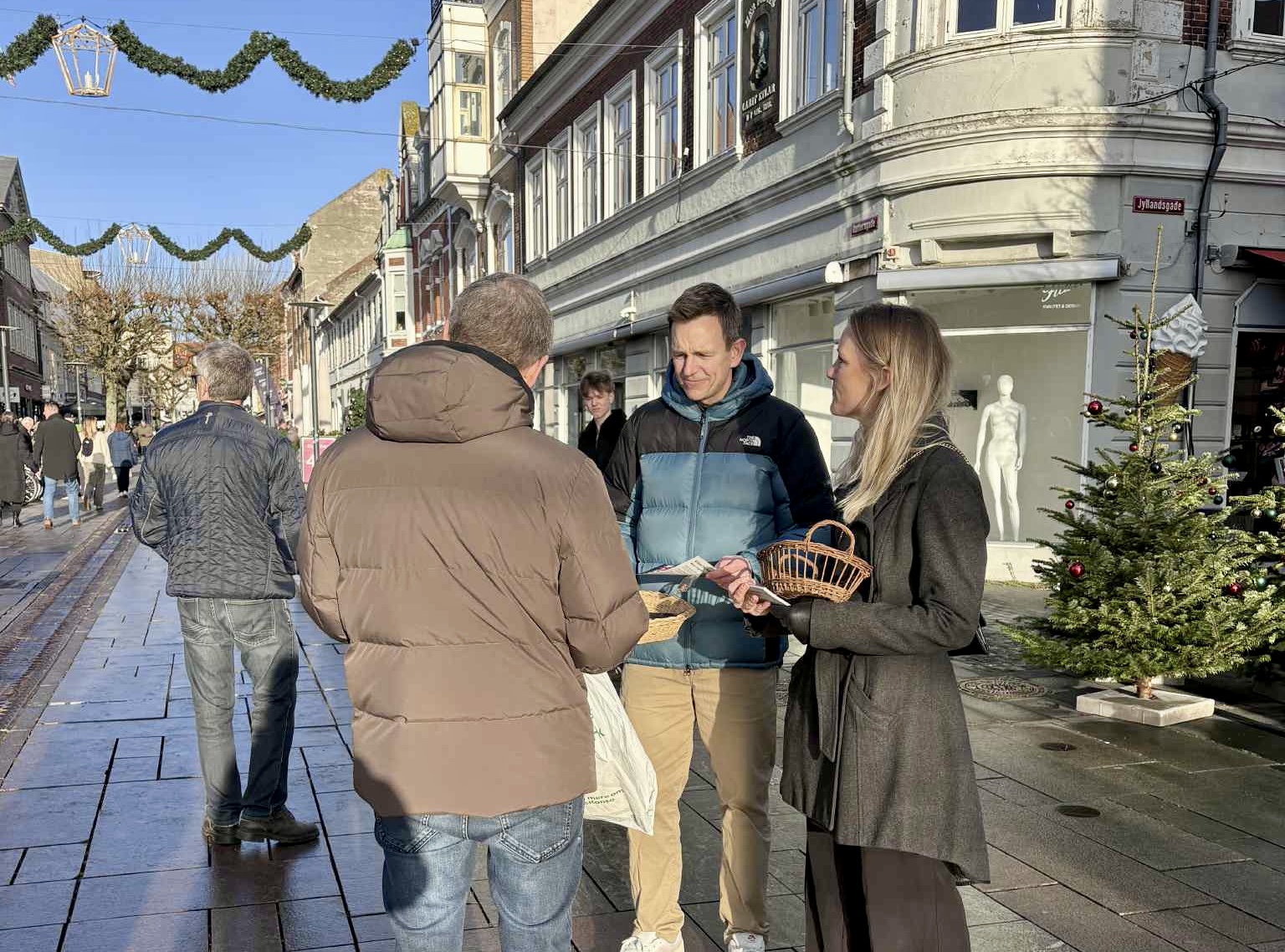 Duften af brændte mandler lå i luften, julelysene glimtede i butikkernes vinduer, og lørdag den 13. december var der liv og travlhed i Fredericias gågade. Midt i julehandlen fik byen også politisk besøg, da fredericianeren Rasmus Stoklund, i dag udlændinge- og integrationsminister for Socialdemokratiet, lagde vejen forbi sin hjemby.