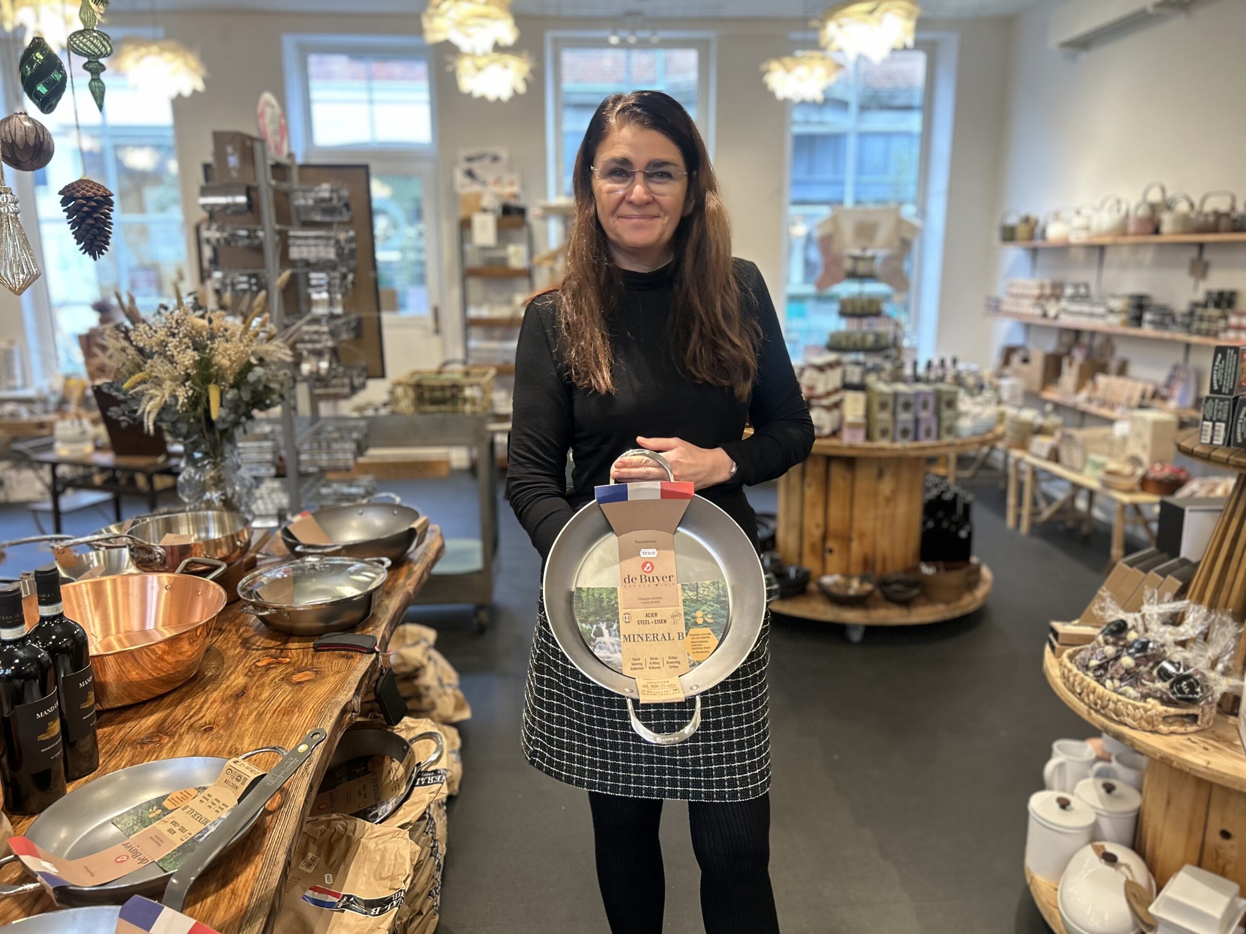 »Det er panderne. Dem ønsker mange sig.« Hun tager en model ned fra hylden – en tung, fransk pande, der ligger solidt i hånden.