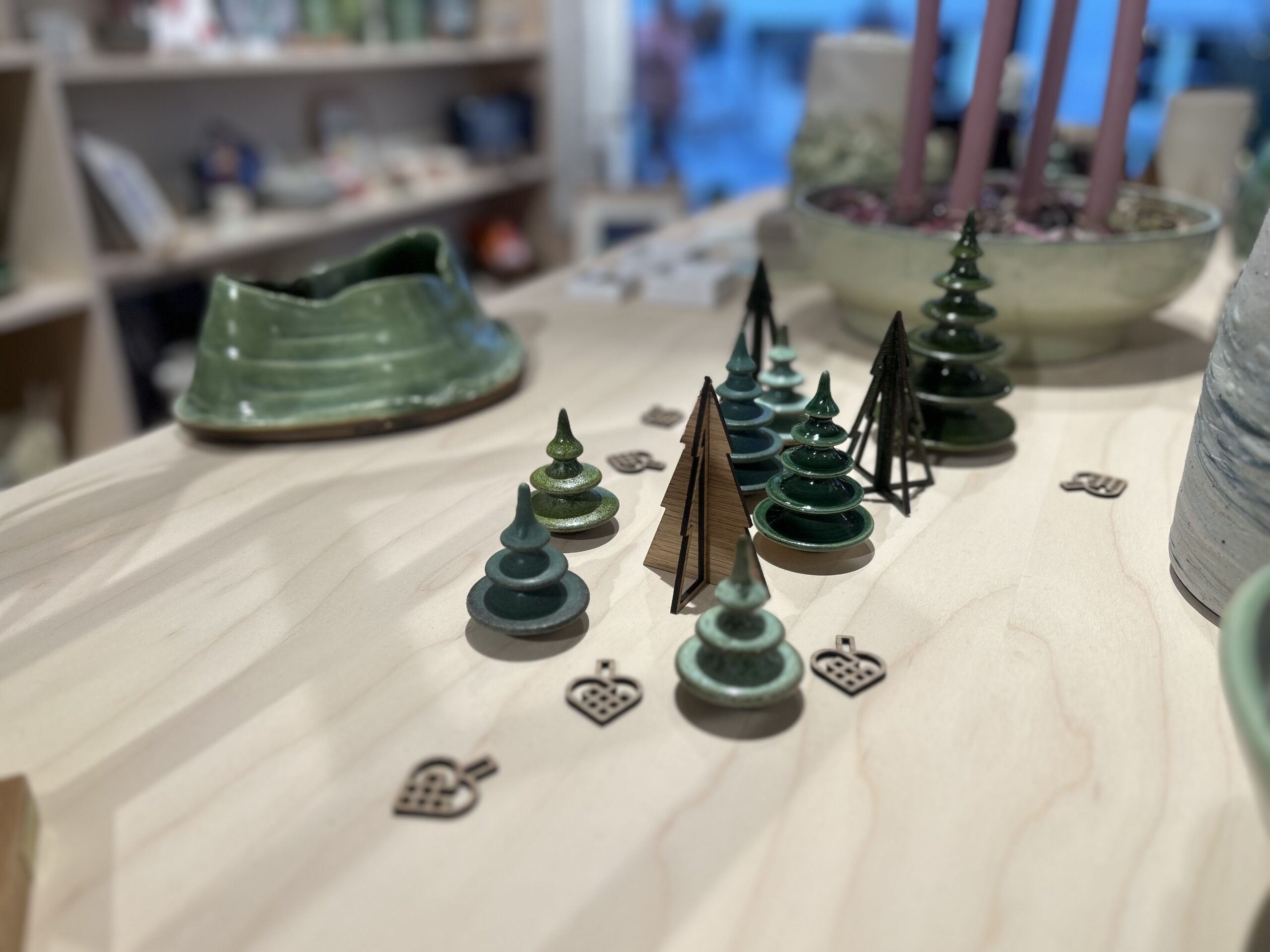 Galleriet er pyntet op til jul, men på en måde, der glider naturligt ind i udstillingen. Meget af det, der pynter, er også noget, man kan købe. Juletræer i kunstneriske fortolkninger, små objekter og værker, der passer ind i sæsonen.