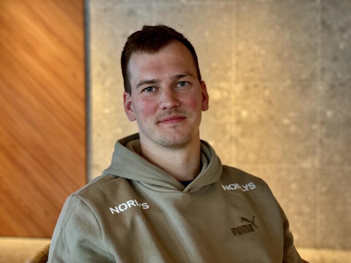 Her sidder Martin Bisgaard. Han ser næsten forbavset ud over situationen, som om han stadig forsøger at fatte, at han overhovedet er her – midt i en landsholdssamling, der for blot få uger siden virkede fuldstændig utopisk.