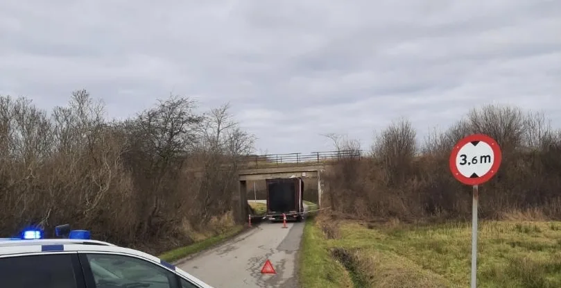 På et vejskilt fremgår det, at et køretøj maks på være 3,6 meter høj for at komme ind igennem broen, og nu er Fyns Politi i gang med at slå fast om broen er lavere end antaget eller om lastbilen er for høj.