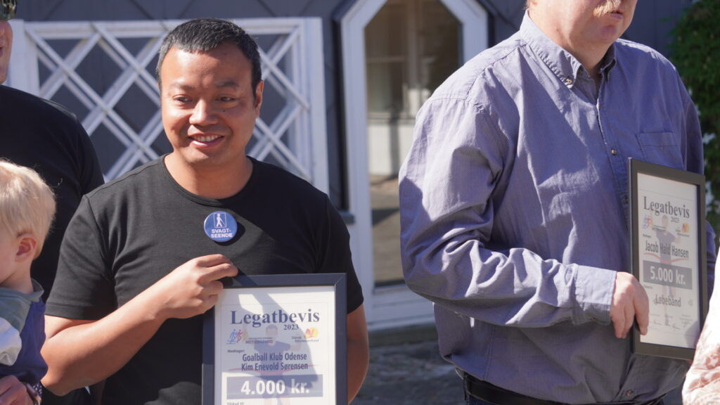 I Goalball Klub Odense var det Kim Enevold Sørensens tur til at modtage støtte til “goalballmasker”. Kim, der beskriver goalball som “en kombination af bowling og håndbold,” ser frem til at udbrede sporten blandt flere synshandicappede.