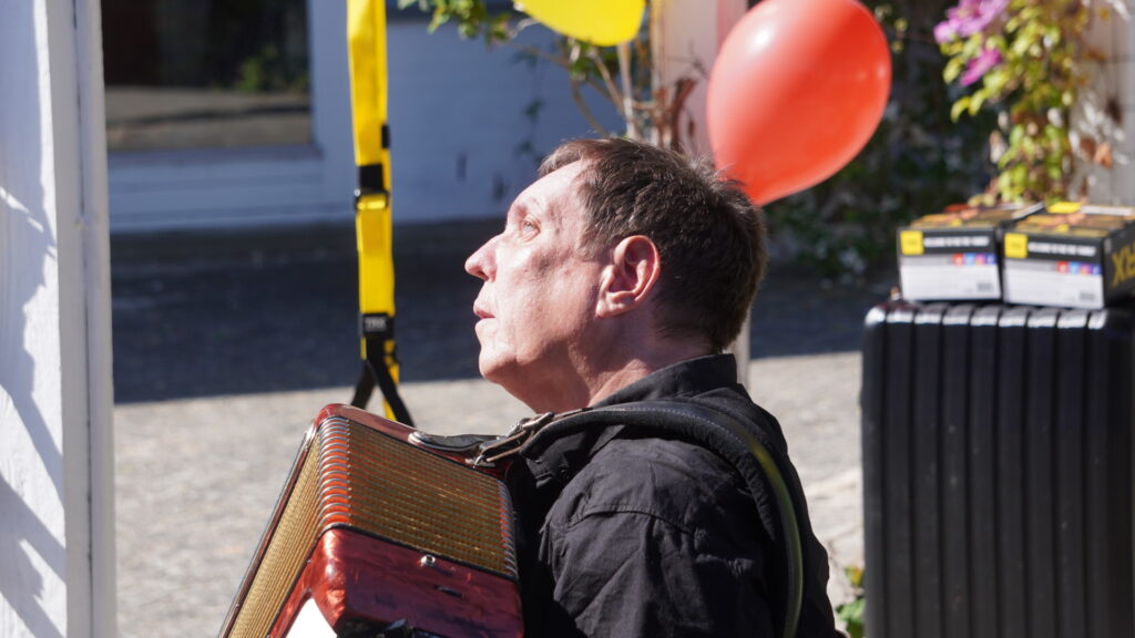 På denne ganske særlige dag blev den ellers travle hverdag sat på pause. Under det klare himmelhvælv trådte folk ud i den frodige gårdhave. Her skabte Kim Preuthun en festlig atmosfære med harmonikaens muntre toner.