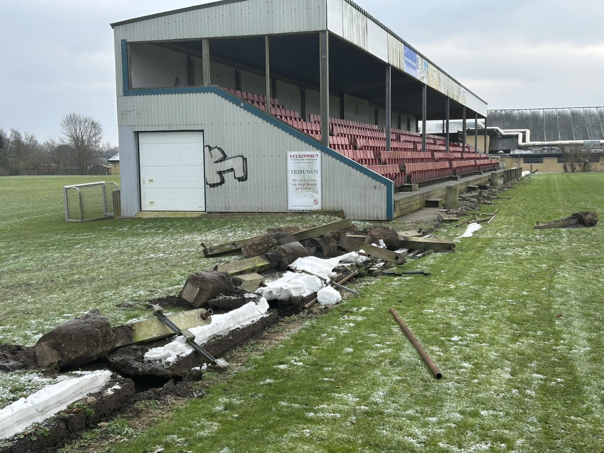 Men først skulle det gamle væk. Preben fik samlet en håndfuld frivillige – fem-seks ældre spillere mødte op med skruemaskiner, og sammen var de omkring otte mand. De gamle plader var skruet fast med ti-tolv skruer i hver, så det løb op i flere tusind skruer, der skulle ud. »Det gik hurtigere, end vi havde regnet med,« griner han. »Det tog en formiddag. Så lagde vi pladerne på en trailer, kørte dem på genbrugspladsen, og så sluttede vi af med smørrebrød og en kop kaffe.«