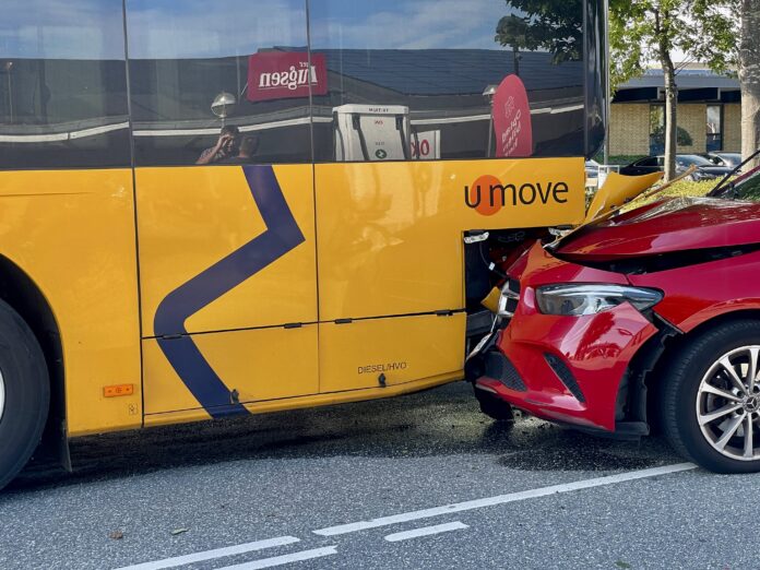 Klokken 11:15 skete et færdselsuheld på Erritsø Bygade i Fredericia. En personbil kørte direkte ind i siden af en elbus. En ambulance og vejhjælp blev sendt til stedet.
