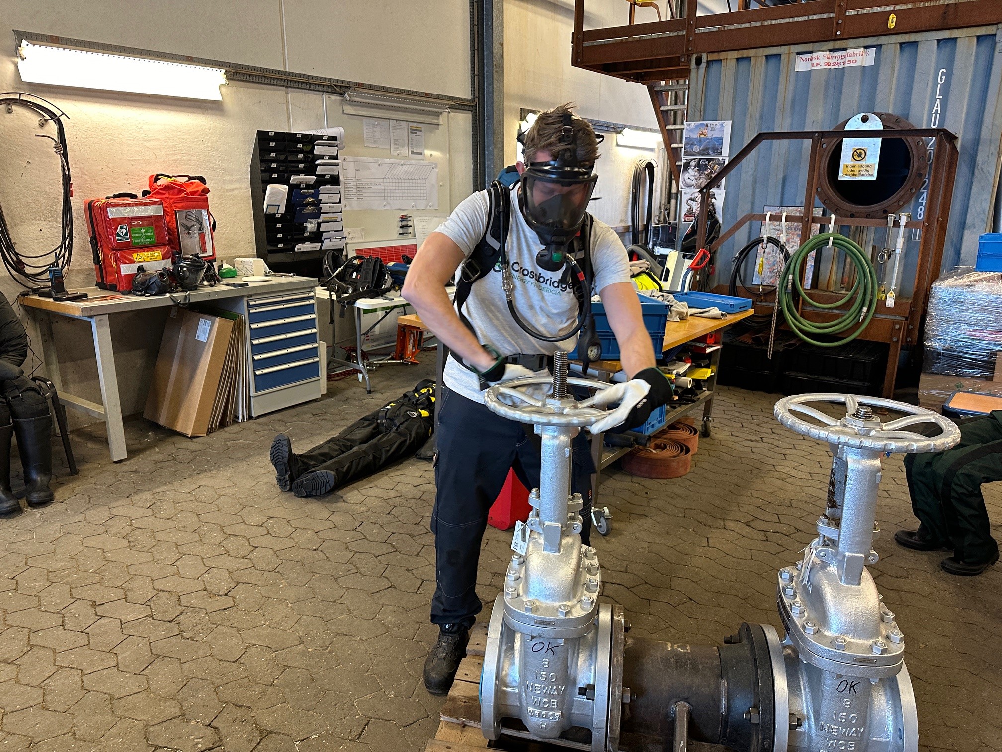 Testen indbefatter at bære to fyldt vanddunke på en 75 meter kringlet rute, derefter slæbe en træningsdukke 10 meter for til sidst at lukke og åbne en stor ventil to gange. Alt gennemføres iført røgdykkemaske med iltflaske.