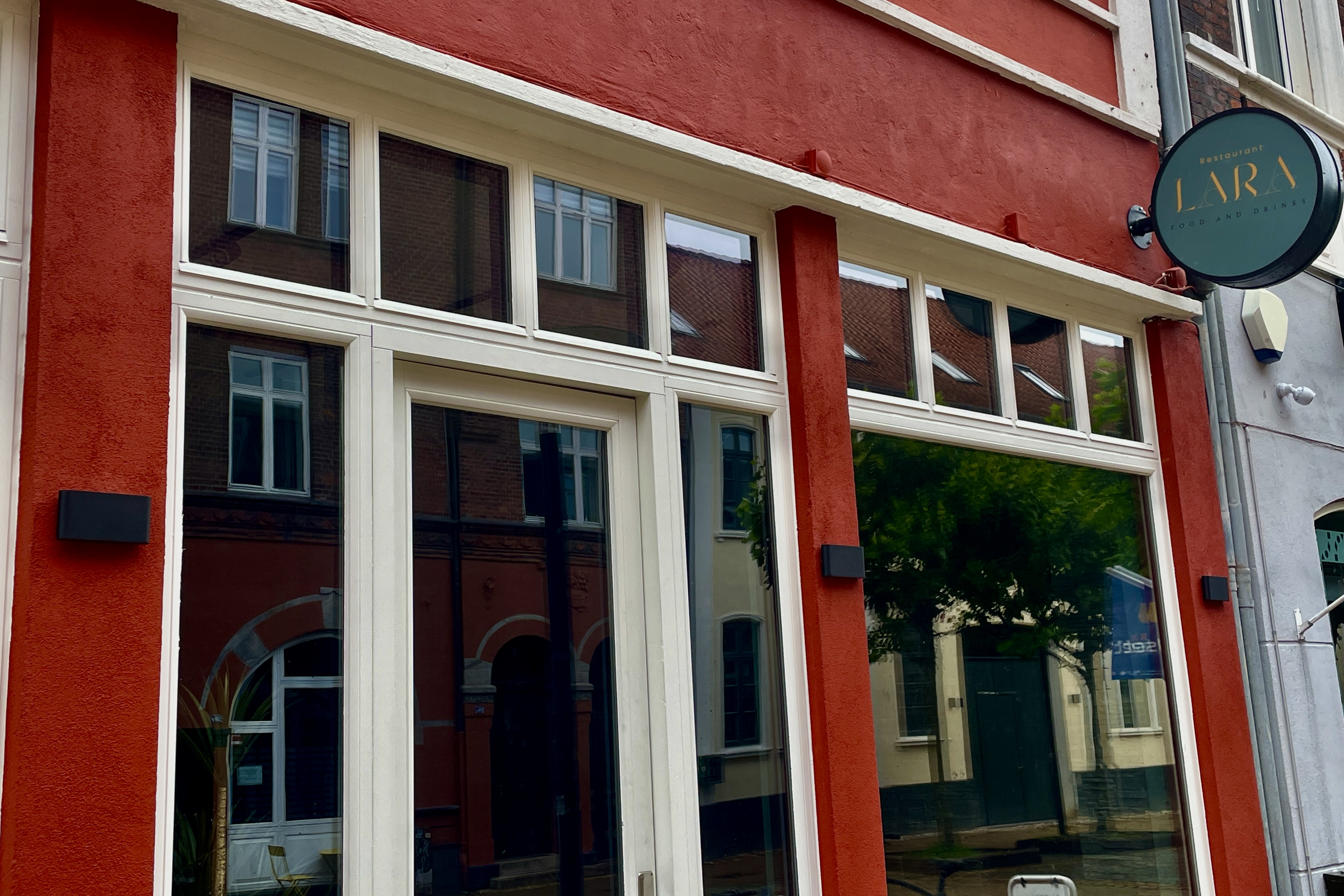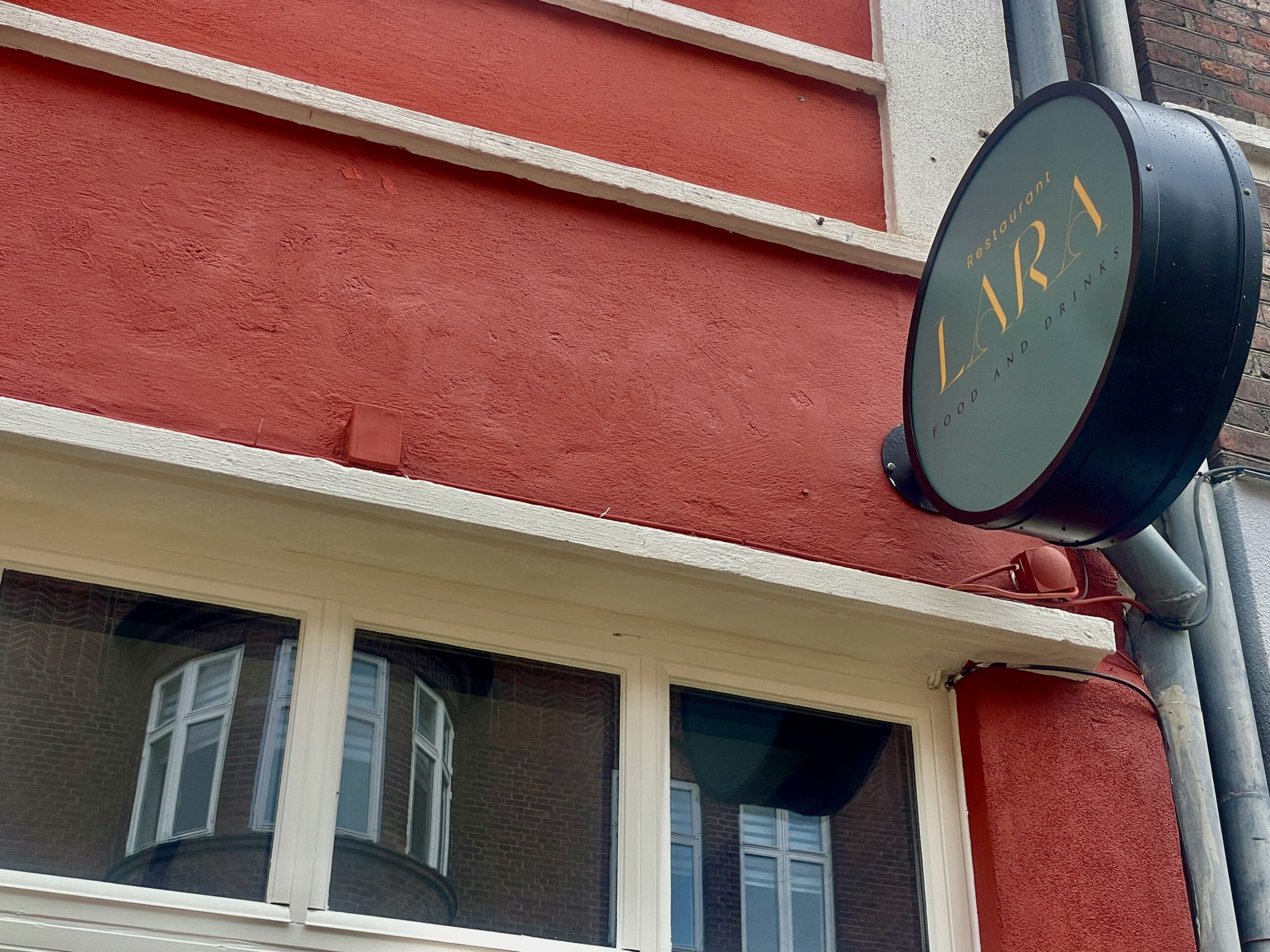 Et nyt skilt er nu kommet op, men det fylder ikke væggen på samme måde som det gamle. I stedet er det mere diskret og elegant placeret. I forlængelse af facaden, lidt ud mod vejen, står der nu “Restaurant Lara” i stilfulde bogstaver. Dette nye skilt afspejler restaurantens moderne og sofistikerede image, og det fremhæver en mere minimalistisk æstetik. Den nye placering og udformning af skiltet signalerer en frisk start og en anderledes oplevelse for de besøgende, samtidig med at det harmonerer med bygningens karakteristiske bordeaux-agtige farve. Skiltets subtile tilstedeværelse gør, at det vækker nysgerrighed og inviterer forbipasserende til at opdage, hvad der gemmer sig bag facaden.