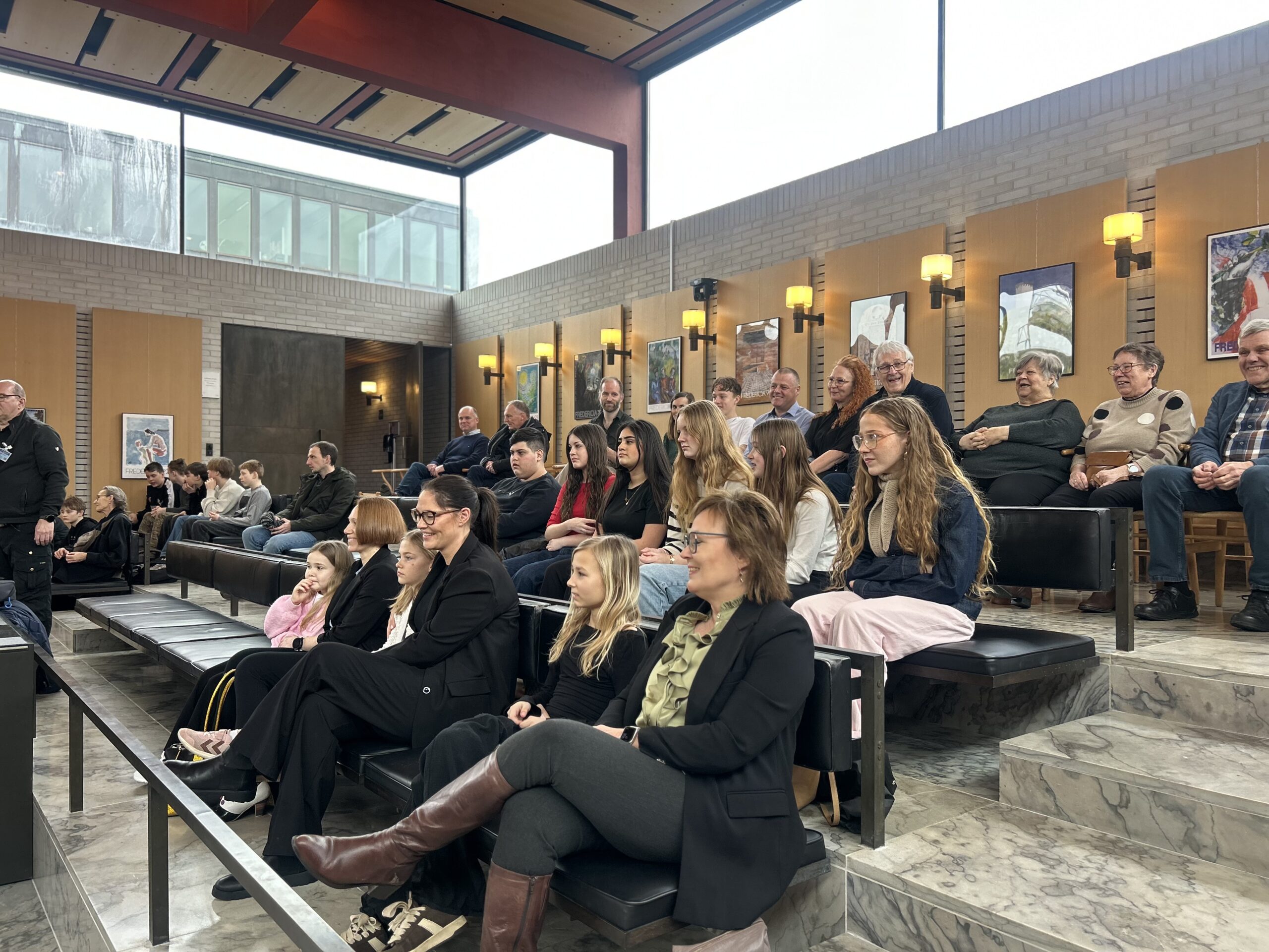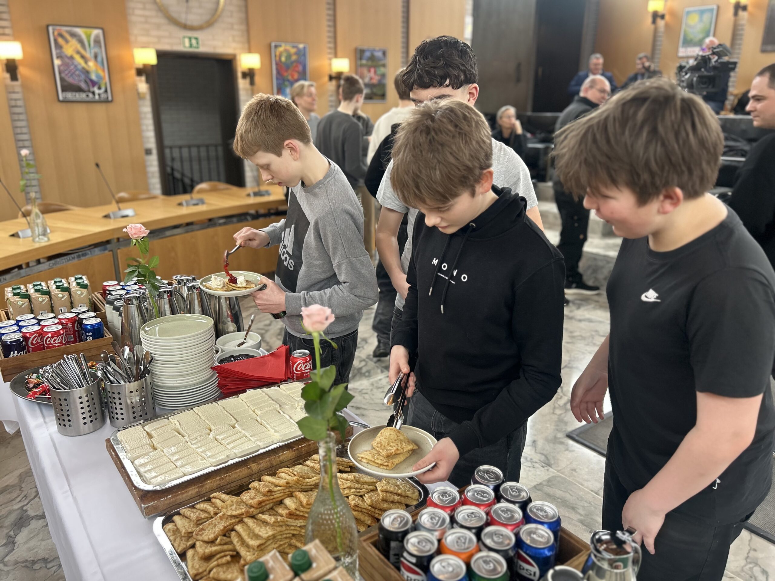 Anna Fridas klasse fik en gave med fra byrådet, og så blev der serveret pandekager og is i byrådssalen. Den formelle tone blev hurtigt afløst af den slags summen, der opstår, når en flok syvende klasses-elever får pandekager midt på en torsdag. Anna Frida selv tog det hele med et smil. »Det er meget sjovt og også meget anderledes, at man har fået hele ens klasse og venner og familie inviteret med herop,« sagde hun, mens pandekagerne blev fordelt omkring hende.