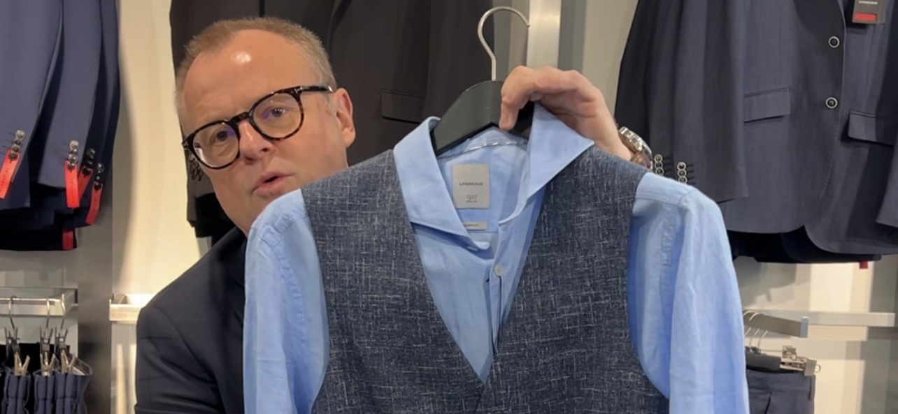 Modehandleren er også meget bevidst om, at festtøjet ikke skal hænge ubrugt i skabet efter en enkelt fest. Derfor demonstrerer han, hvordan den samme blå habitjakke kan anvendes mere afslappet med chinos fra Bison, en let hørskjorte og en matchende ternet vest, som hurtigt skaber et helt nyt og frisk look.