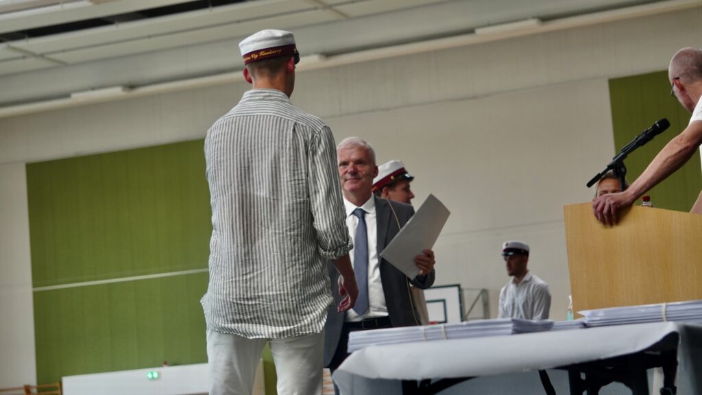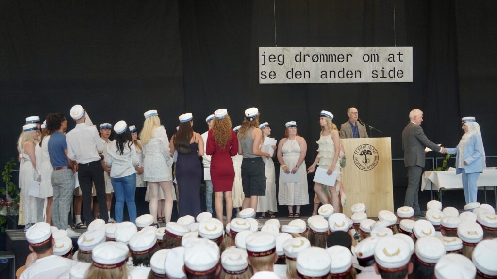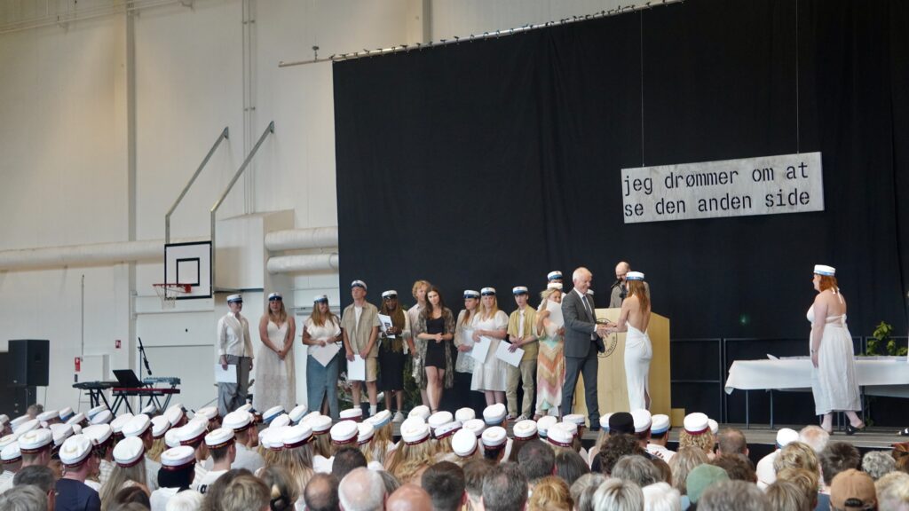 Efter alle talerne og præsentationerne blev det tid til det mest ventede øjeblik – overrækkelsen af eksamensbeviser. Efter tre års hårdt arbejde, udfordringer, succeser og venskaber, blev studenterne officielt uddimitteret fra Fredericia Gymnasium.