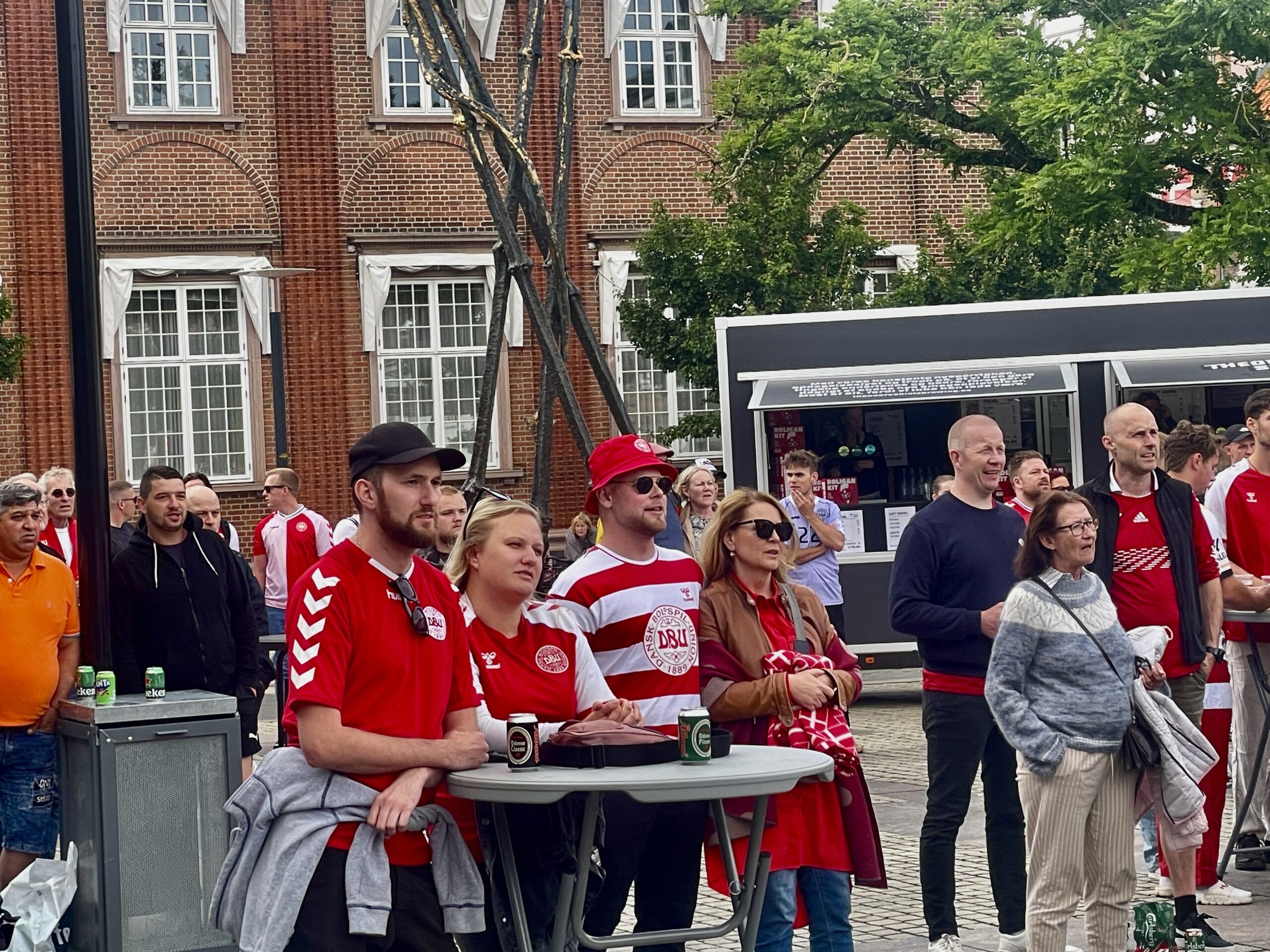 Selvom der var regnvejr i udsigt, mødte en del fans op, og de lod sig ikke skræmme af vejrudsigten. Rådhuspladsen eksploderede i jubel, da Christian Eriksen scorede efter 17 minutter. Fansene jublede og fejrede målet under paraplyerne, mens de trofast støttede deres hold.