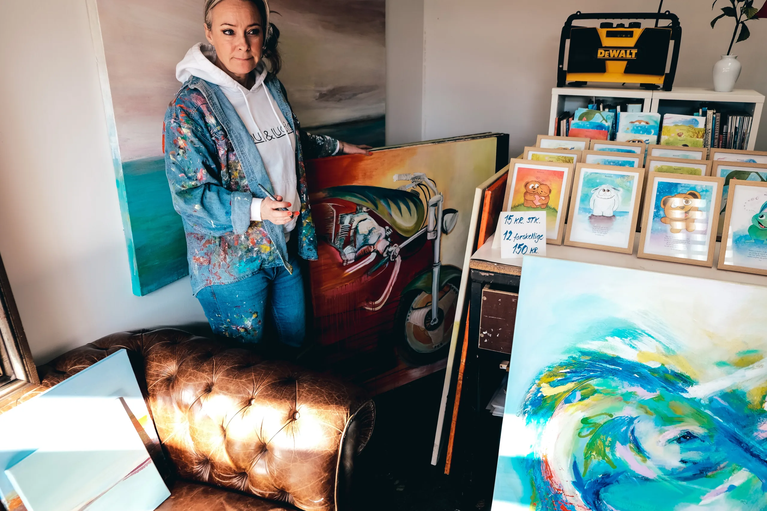 Fra den fjerne ende af værkstedet lyder der musik og penselstrøg, Erik Møller Jørgensen, som Henny deler værksted med er i gang. Overalt i lokalet er der spor af kreativitet – farveblyanter, pensler og andet værktøj ligger spredt ud over bordet, og gamle malerkrukker er fyldt med en regnbue af farver.