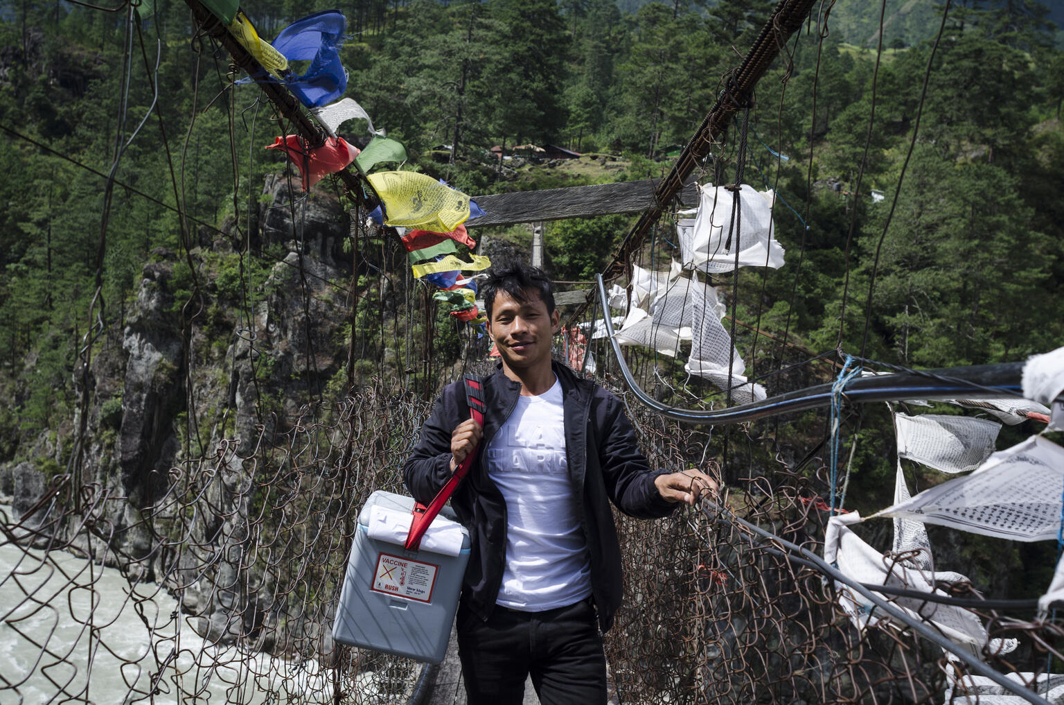 On 21 September 2022 in Northeast India, Alternate Vaccine Delivery (AVD) worker Dematso Khamblai poses for a photo while crossing a pedestrian suspension bridge spanning a river, as part of a team on its way to a Village Health Nutrition Day event, a mobile medical and immunization intervention. Health workers operating in the area must cross this type of bridge several times each day to shorten their travel time. Dematso, 29, has been working as an AVD person since 2015. Prior to the outbreak of COVID-19, he made seven or eight day-long treks per month to reach villages that are not reachable by road. Since COVID-19 vaccines became available, his workload has increased significantly, and he spends around 20 days per month reaching villages with vaccines. In the eastern mountains of Northeast India, where the sun rises early, Dematso Khamblai’s day of delivering vaccines starts well before dawn. He is a member of the area’s Alternative Vaccine Delivery System. At 3:30 a.m., Dematso leaves his home and heads to the local health centre. There, he stocks up on vaccines, packing them into a grey insulated carrier. By 4:30 a.m., he is on the road, bumping along for as far as a motorbike. When the roads end, he begins his trek over hills, through valleys and across rickety suspended bridges. His mission: to deliver vaccines to villages hidden away in the mountains of this north-east corner of India. “The mountains are steep, and we have to be very careful while hiking,” Dematso said. “It becomes dangerous during the monsoon season as rains make the trek slippery. There are also frequent landslides during the monsoon season, which make the trek tough.” Northeast India, known for its natural beauty and rugged terrain, poses a challenge for health workers striving to ensure that all children receive necessary vaccinations. High mountains, deep gorges, and dense forests, combined with unpredictable weather conditions, make the journey to reach vulnerabl