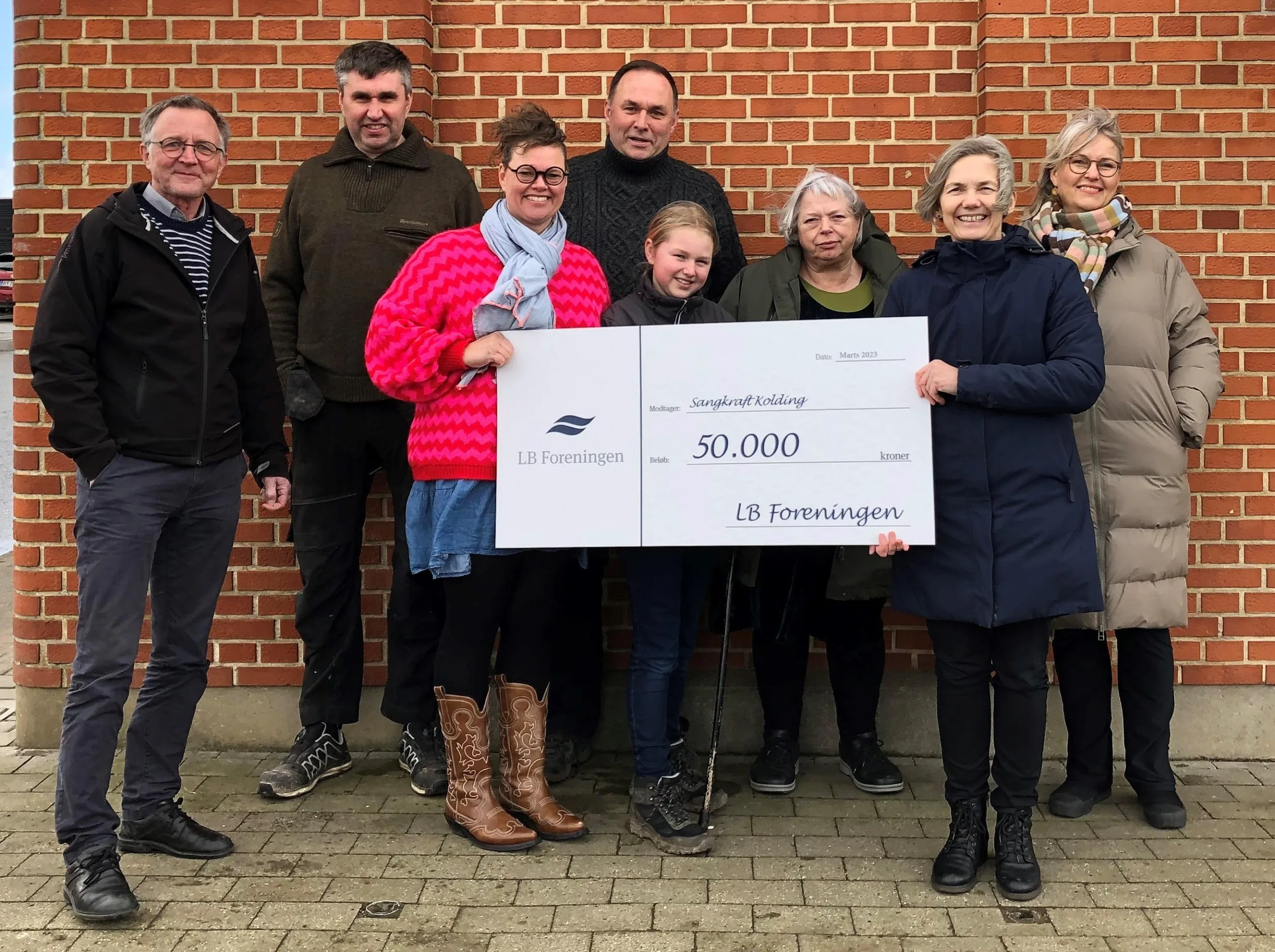 Tre lokale repræsentanter for LB Foreningen i Syddanmark har 15. marts overrakt 50.000 kr. til Sangkraft Kolding. Pengene skal gå til, at koldingenserne i 2023 kan få glæde af en stor FællessangsKaravane ved 7 arrangementer rundt omkring i kommunen.