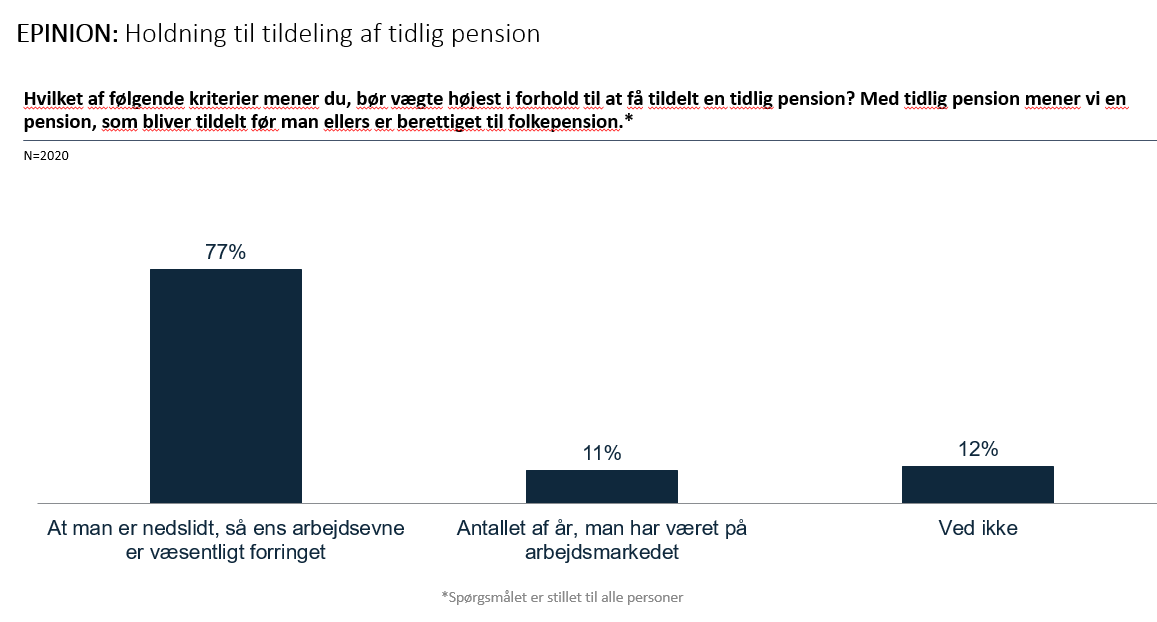 I målingen blandt 2.020 repræsentativt udvalgte danskere svarer 77 procent, at det er nedslidning og sygdom, der bør afgøre retten til tidlig pension. Kun 11 procent mener, at kriteriet skal være, hvor mange år man har været på arbejdsmarkedet.