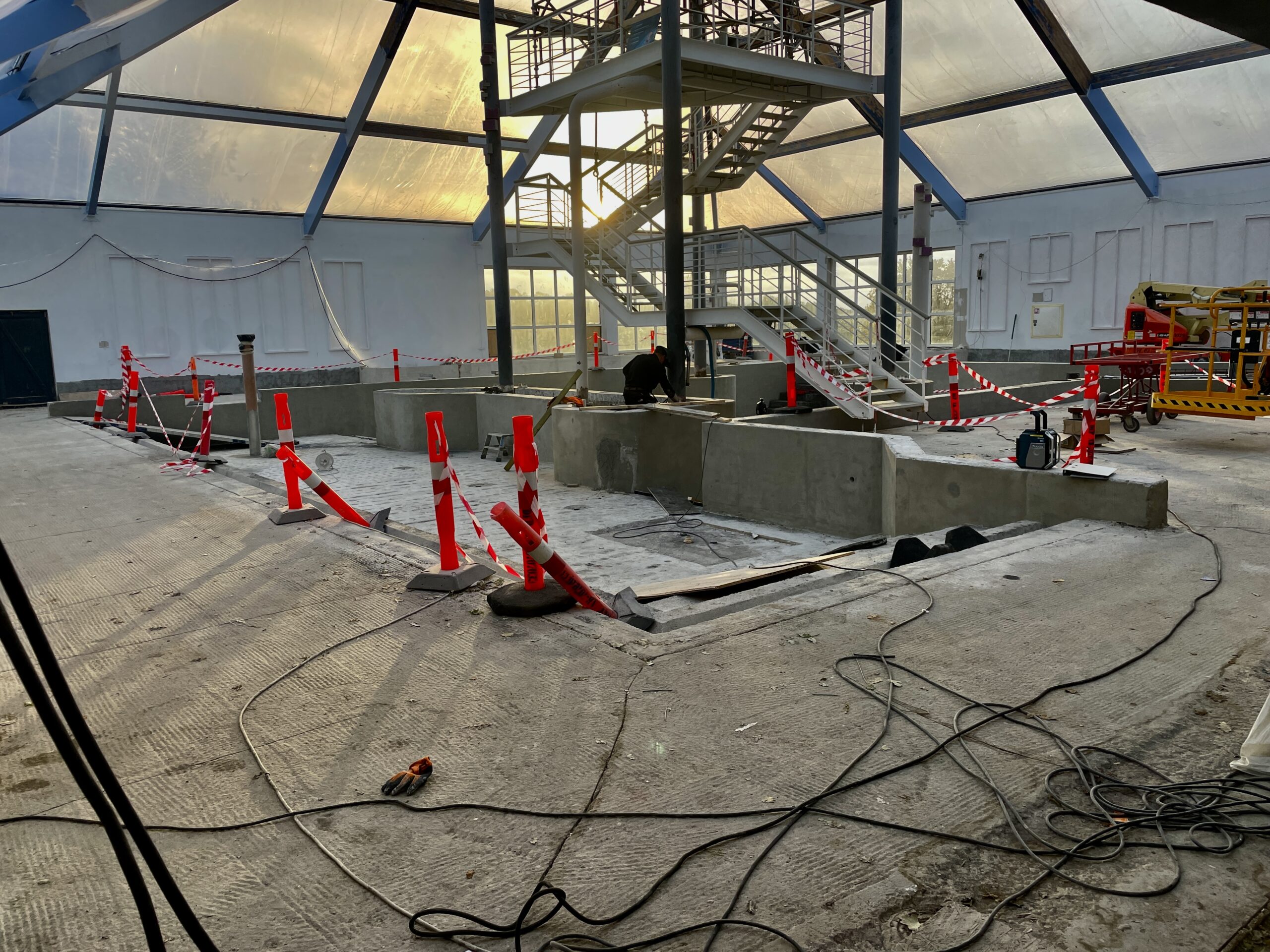Under en guided tur indenfor i det nuværende afspærrede område, der er lukket for offentligheden, giver Jacob Falkenby en opdatering på, hvordan projektet skrider frem. Man kan se håndværkerne arbejde energisk, og man skal spidse ørerne, for der er liv og røre og lyden af svejsearbejde fylder luften.