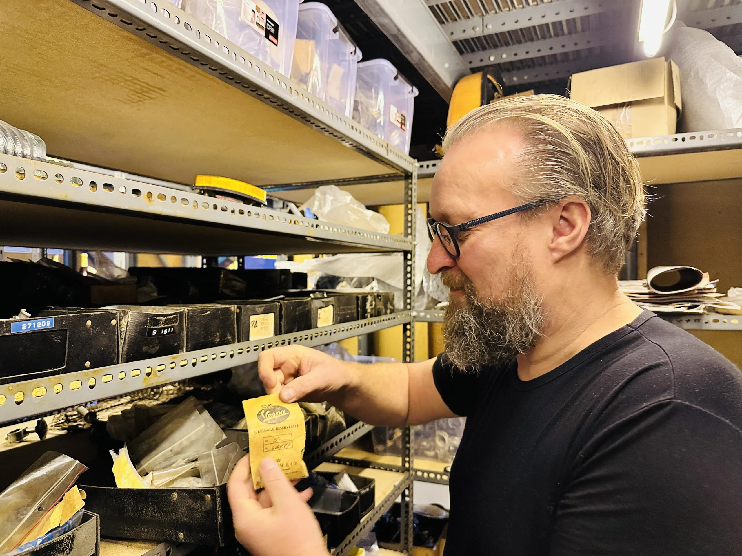 Peter Wullf Nørholm hælder lidt mere te op til os begge, og vi fortsætter snakken på hans lager, hvor tusindevis af små dele til Vespaen vises frem. Selvom der er mange reservedele, så har Peter en historie for hver enkelt, og kan huske, hvor han købte den. Det er ren passion.