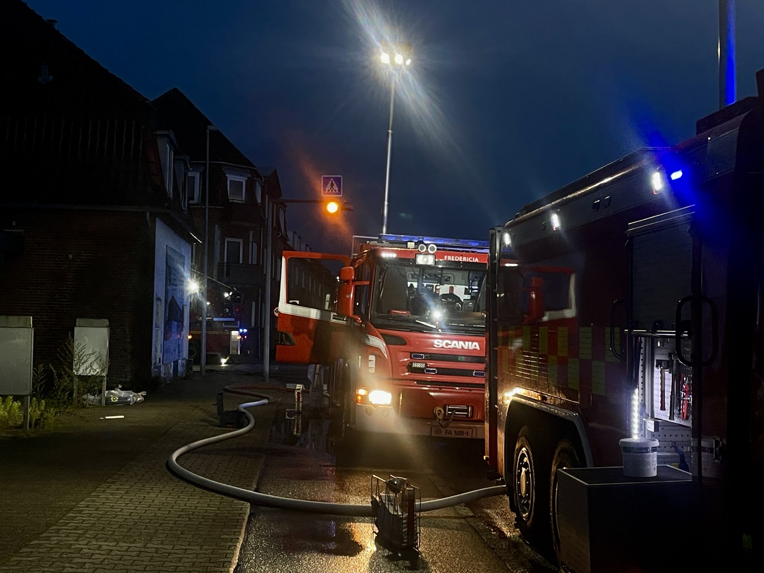 Politiet har afspærret området. TrekantBrand blev alarmeret 19.19 med en melding om brand i industribygning.