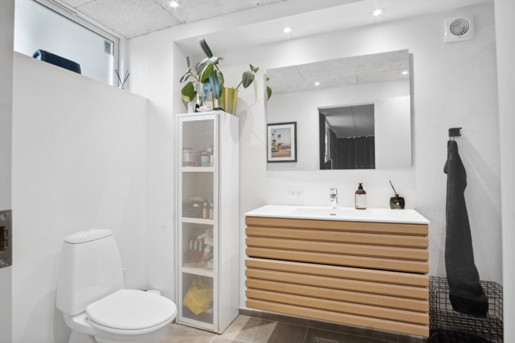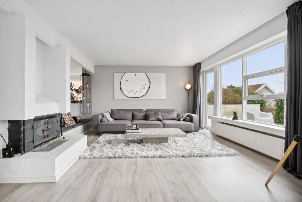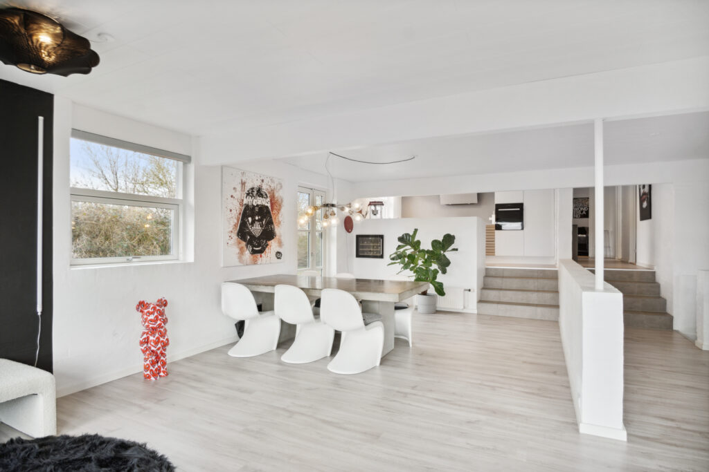 Villaens hjerte er det indbydende køkken-alrum, udført i forskudte niveauer og med dekorative halvmure, hvilket tilføjer et dynamisk touch til det samlede indtryk. Det højtliggende køkken fra Designa, med lamelfronter og en elegant, smal, hvid bordplade, udstråler en ubestridelig stil, der harmonerer med resten af boligen. Her skaber sollyset et levende maleri, der ændrer sig minut for minut, mens den indbyggede brændeovn bidrager med en beroligende varme og hygge i aftentimerne.