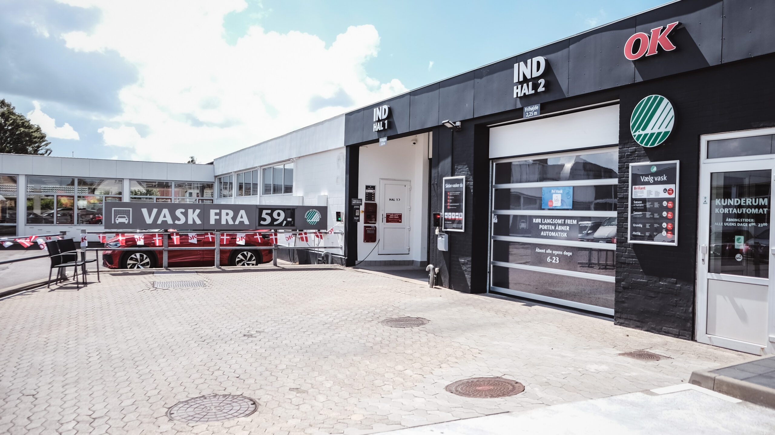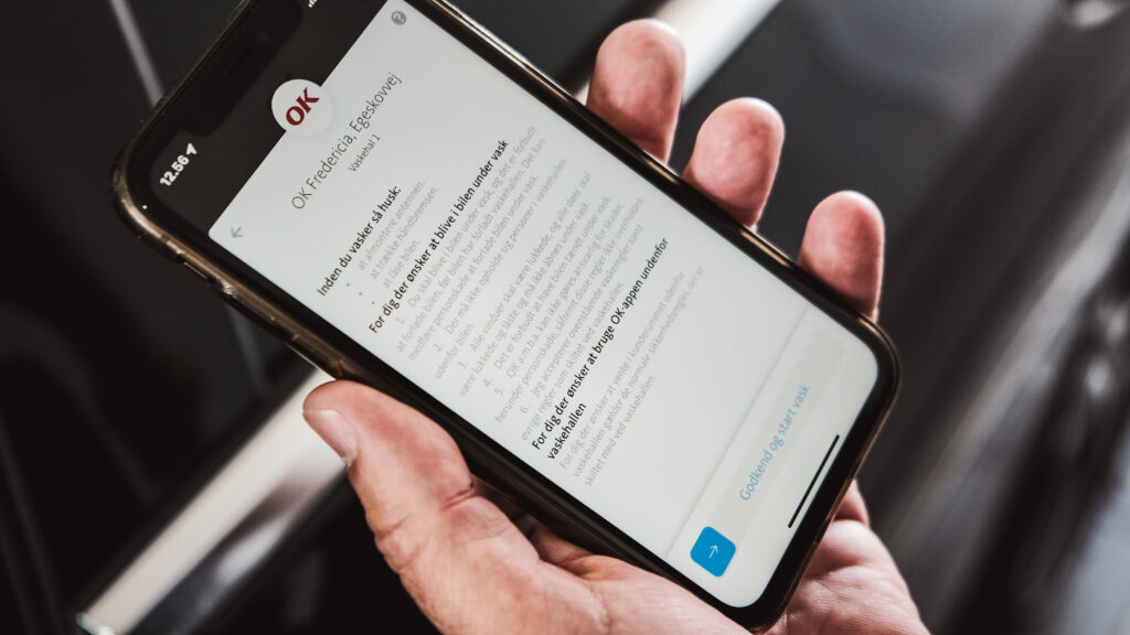 Det er en tirsdag eftermiddag, og vi bliver vinket ind i hal nummer 1 af Henrik, der står og venter, da vi ruller ind på pladsen ved Egeskovvej i Fredericia. Solen spejler sig i de nypolerede fliser. Det er nemt at starte vasken i OK-appen på telefonen, uden overhovedet at behøve at forlade bilens komfortable sæder. Vi vælger den grundige vask, som også er den, man kan prøve til 1 krone den kommende weekend.